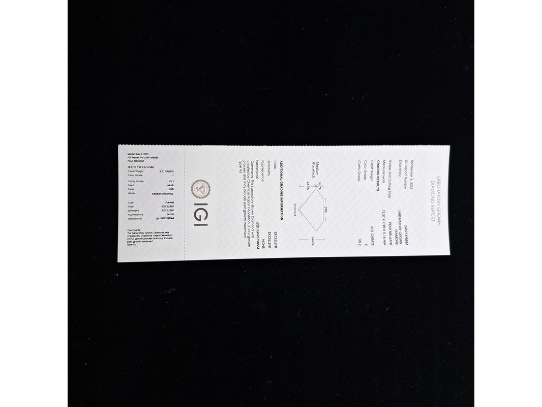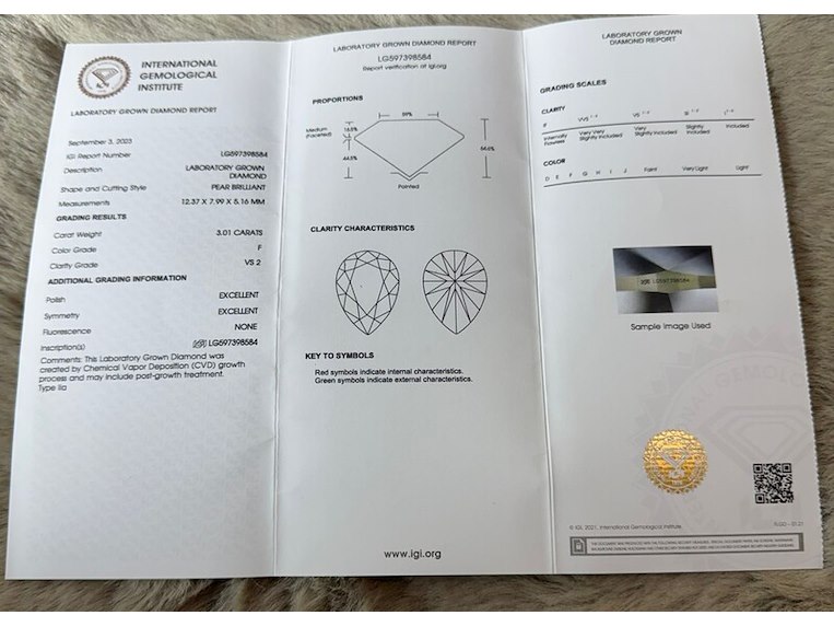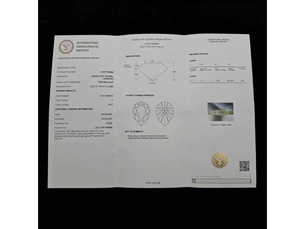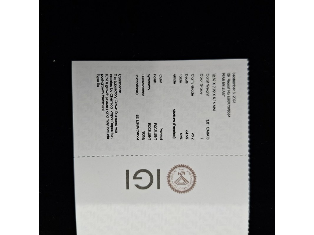 Product: 3.01 karaat Pear briljant diamond (Gecertificeerd IGI LG597398584) Conditie: Nieuw Specificaties: Eco (lab-grown) Gewicht: 3.01 karaat Kleur: F Zuiverte: VS2 Slijpvorm: Excellent Certificaat: IGI (LG597398584)