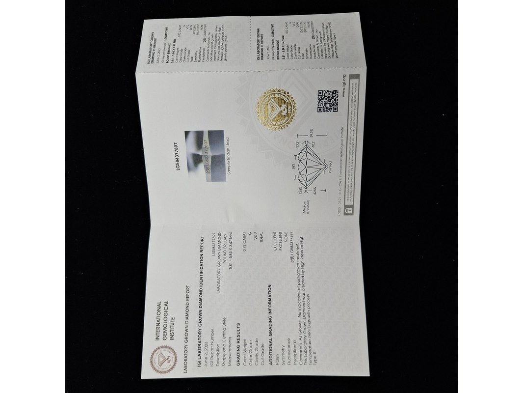 Product: 0.72 karaat diamant (gecertificeerd) IGI (LG584377897) Conditie: Nieuw Specificaties: Eco (lab-grown) Gewicht: 0.72 karaat Kleur: G Zuiverte: VS1 Slijpvorm: Excellent Certificaat: IGI (LG584377897)