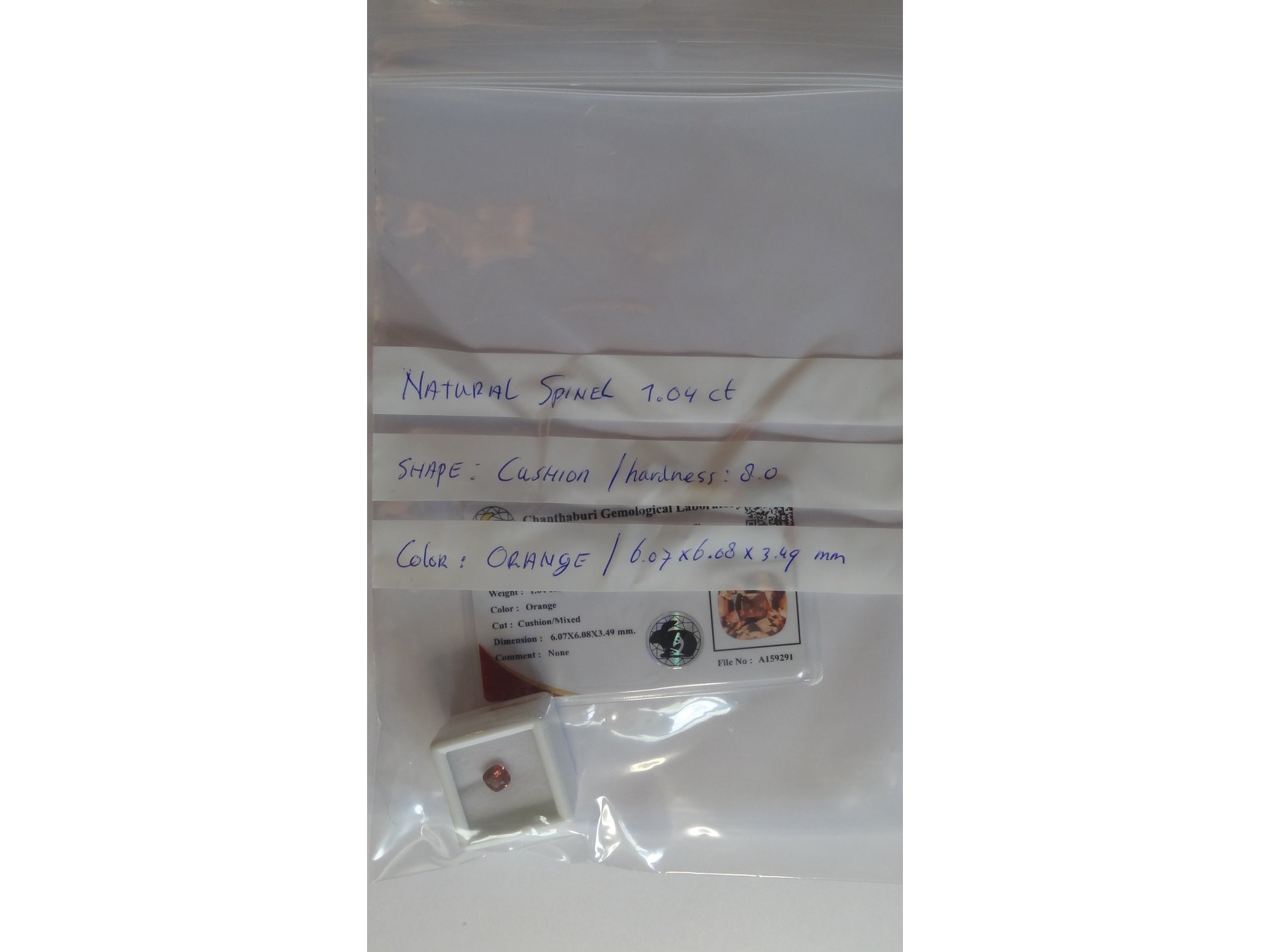 Product: Edelsteen | Natural Spinel 1.04ct Conditie: Nieuw Specificaties: Natural Spinel. Weight : 1.04 ct Shape : Cushion cut Color : Orange Clarity : SI Hardness : 8.0 Treatment : none Dimensions : 6.07 x 6.08 x 3.49 mm. Compleet met GLC rapport. Wordt geleverd in een edelsteendoosje