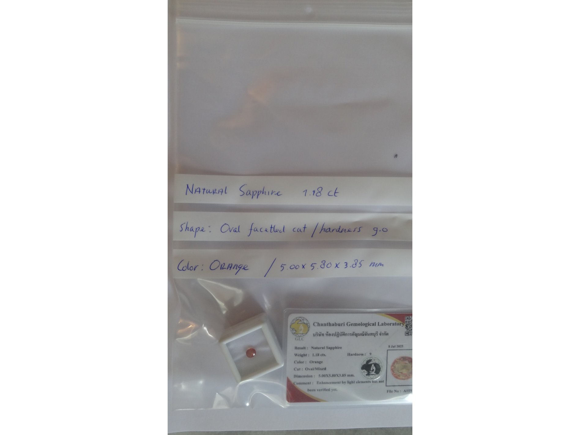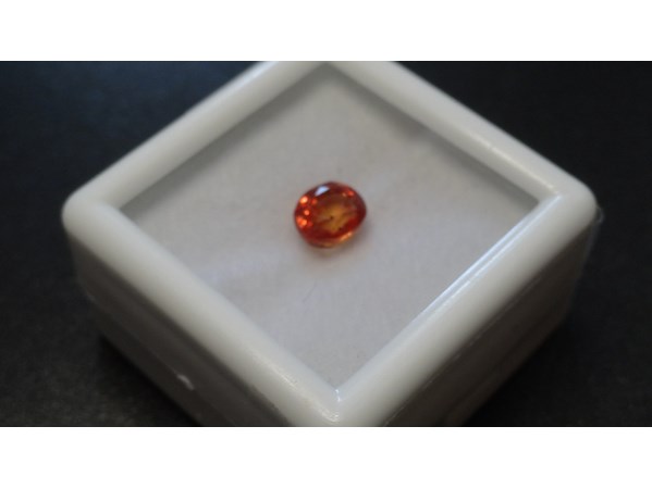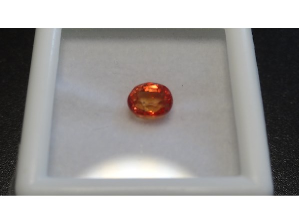 Product: Edelsteen | Natural Sapphire 1.18ct Conditie: Nieuw Specificaties: Natural sapphire. Weight : 1.18 ct Shape : Oval facetted cut Color : Orange. Clarity : Clean Hardness : 9.0 Treatment : BE heated Dimensions : 5.00 x 5.80 x 3.85 mm. Compleet met GLC rapport. Wordt geleverd in een edelsteendoosje.