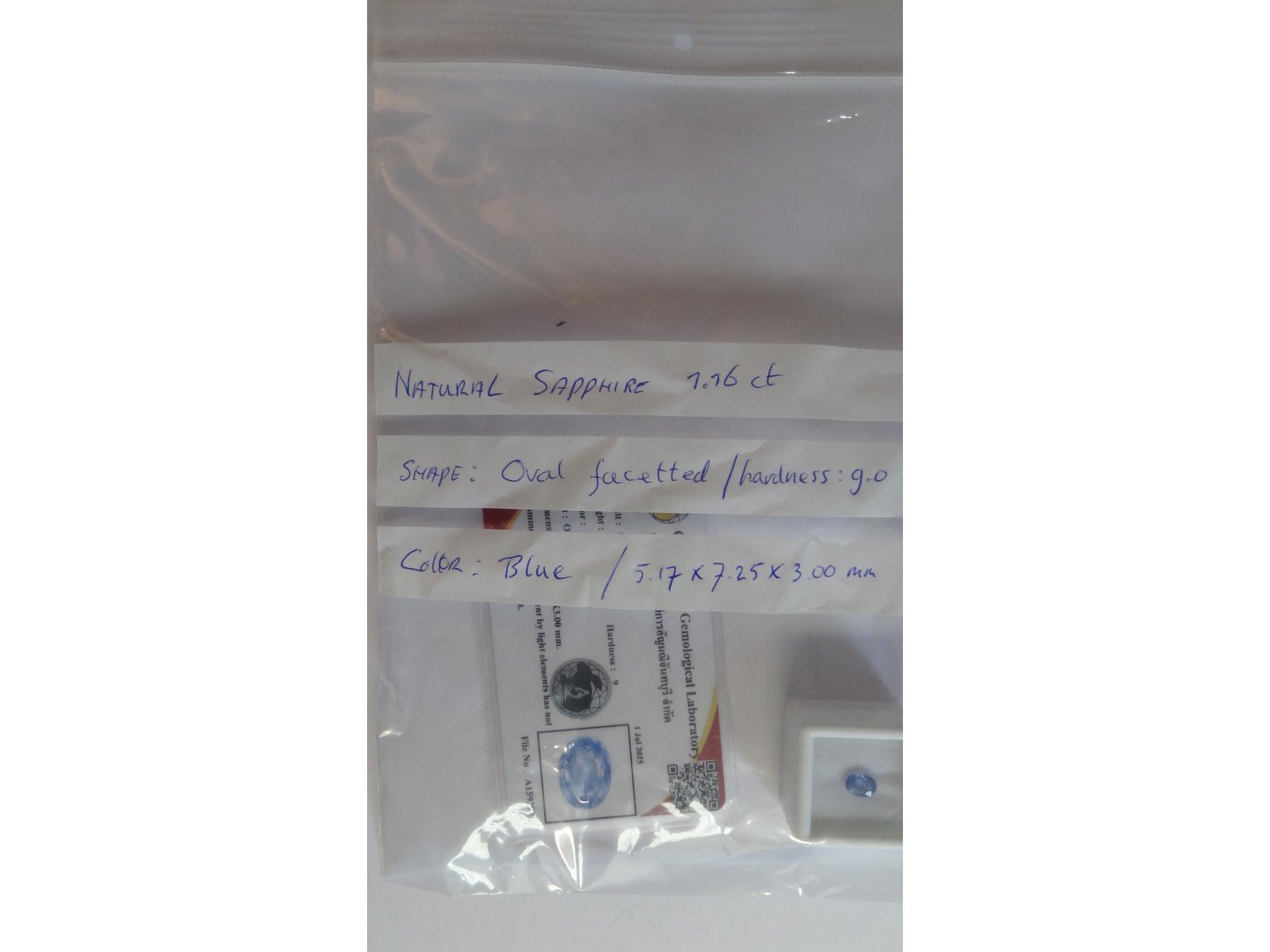 Product: Edelsteen | Natural Sapphire 1.16ct Conditie: Nieuw Specificaties: Natural Sapphire. Weight : 1.16 ct Shape : Oval facetted cut. Color : Blue Clarity : SI Hardness : 9.0 Treatment : BE Heated Dimensions : 5.17 x 7.25 x 3.00 mm. Compleet met GLC rapport. Wordt geleverd in een edelsteendoosje.