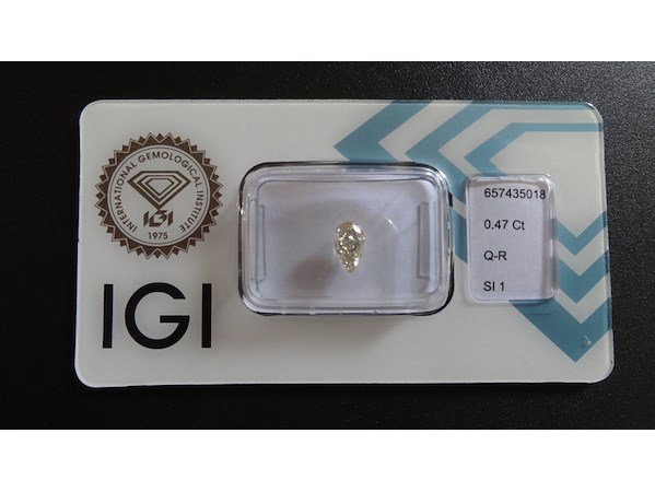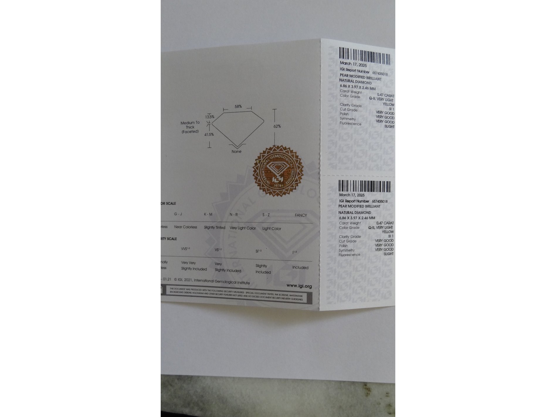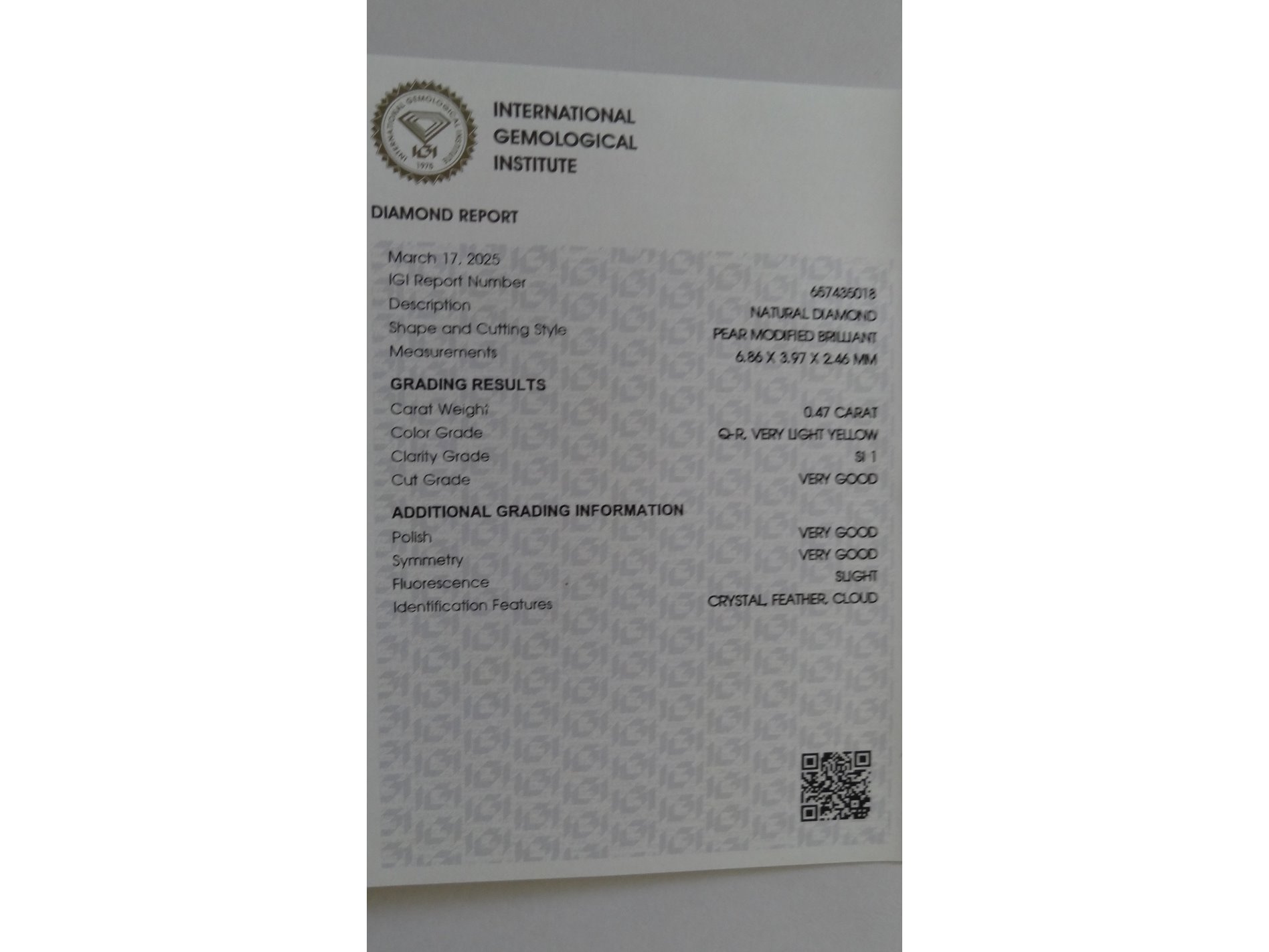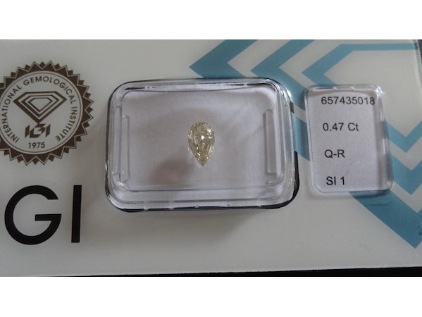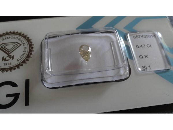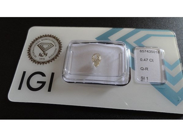 Product: Natural diamond | 0.47ct ( IGI Gecertificeerd ) Conditie: Nieuw Specificaties: Natural diamond. Weight : 0.47 ct Shape : Pear modified brilliant Color : Very light yellow. Clarity : SI1 Sealed : Ja Dimensions : 6.86 x 3.97 x 2.46 mm Compleet met IGI certificaat.