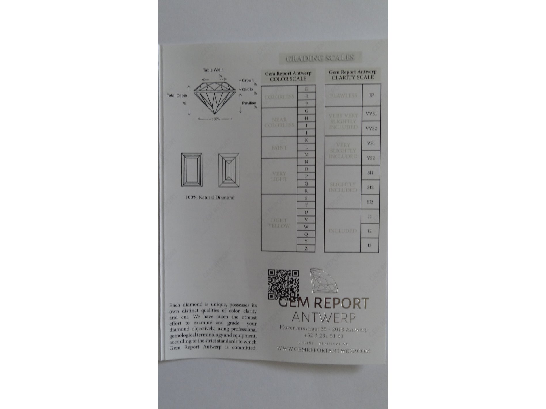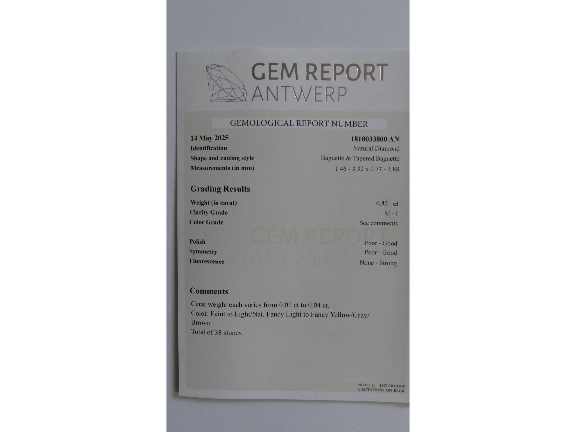 Product: Natural diamond | 0.82ct Conditie: Nieuw Specificaties: Natural diamods. Total weight : 0.82 ct. Shape : Baguette and tapered baguette Color : Faint to light/nat. Fancy Light to fancy yellow/gray/brown. Clarity : SI - I Dimensions : 1.46 - 3.32 x 0.77-1.88 mm Total of 38 stones Compleet met GEM Report Antwerp