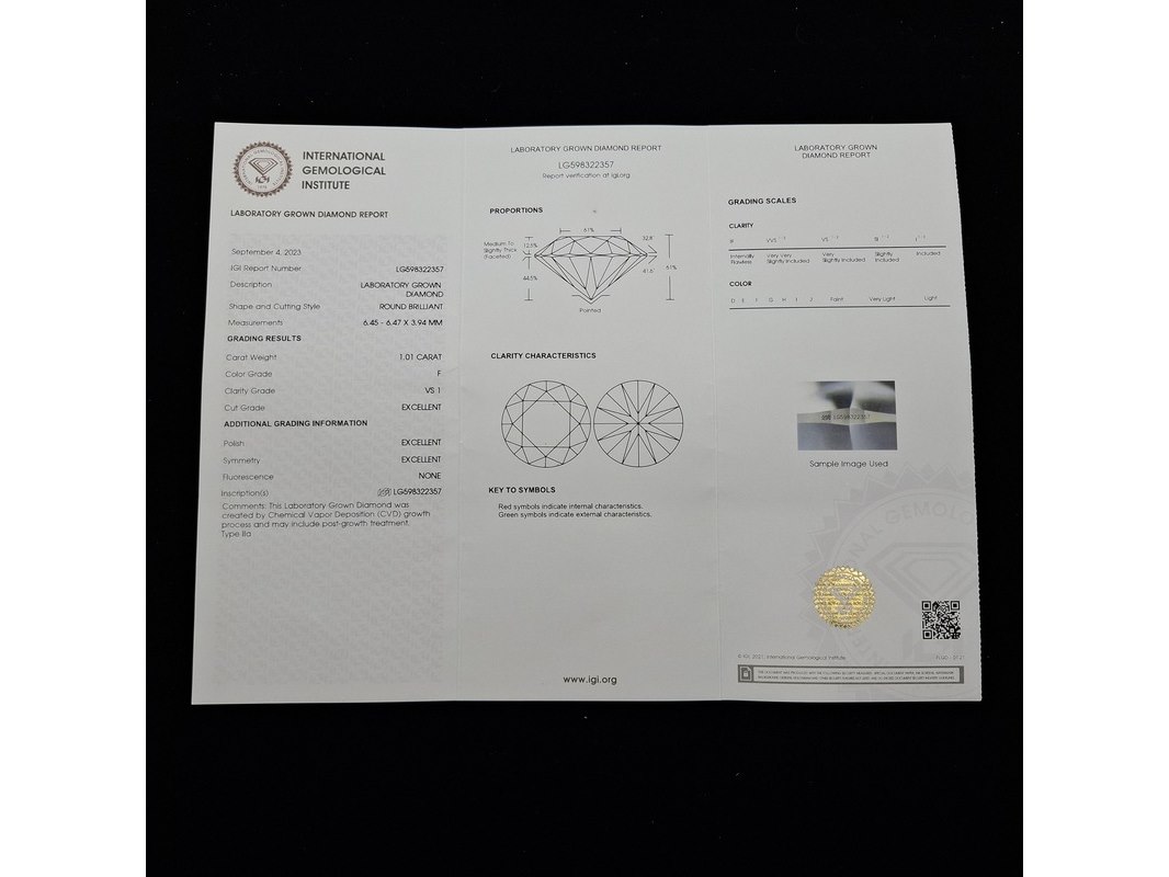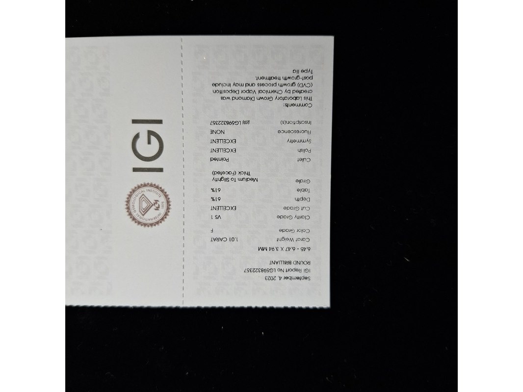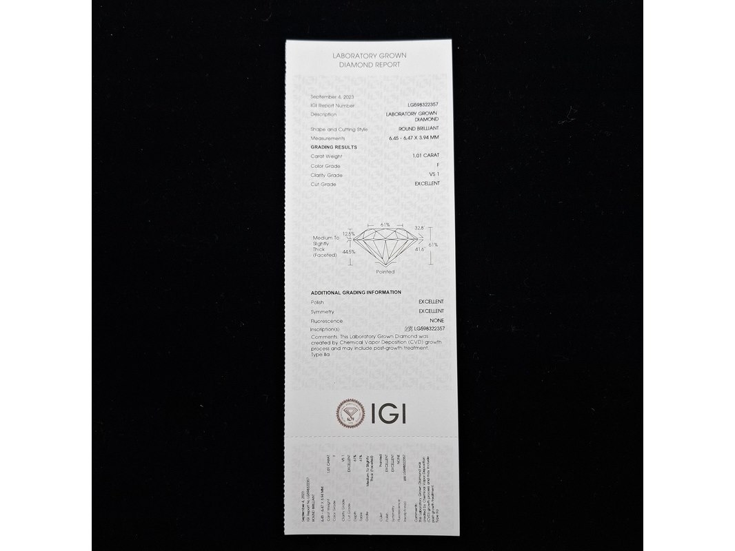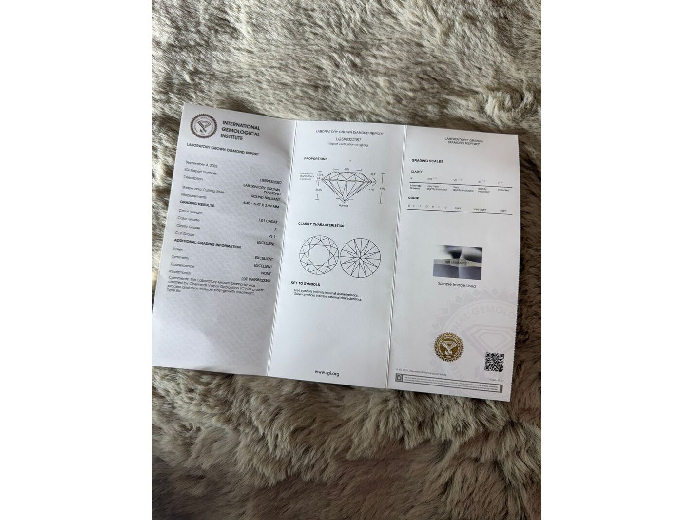 Product: 1.01 karaat diamant (gecertificeerd) Conditie: Gebruikt Specificaties: Eco (lab-grown) Gewicht: 1.01 karaat Zuiverte: VS1 Slijpvorm: Briljant geslepen Certificaat: IGI (LG598322357)