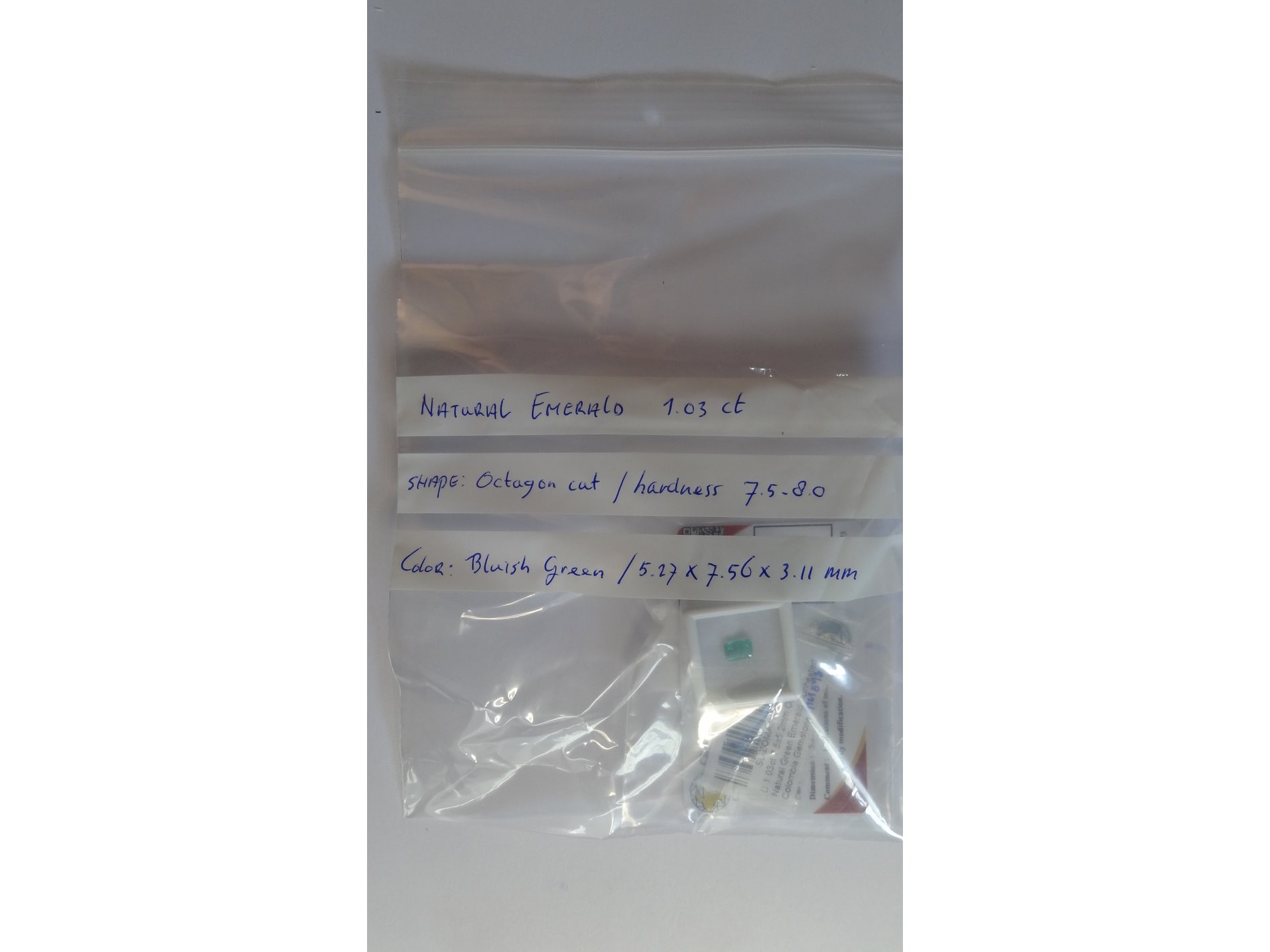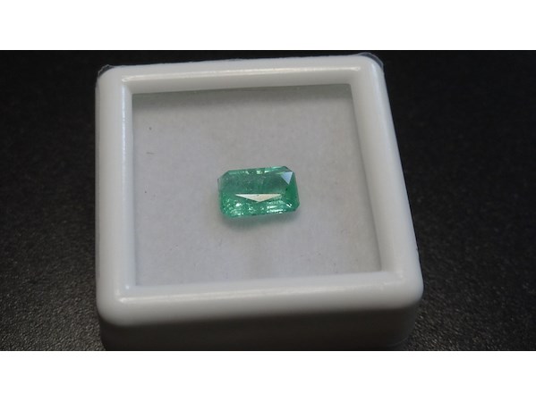 Product: Edelsteen | Natural Emerald 1.03ct Conditie: Nieuw Specificaties: Natural Emerald. Weight : 1.03 ct Shape : Octagon cut. Hardness : 7.5/8.0 Color : bluish green. Clarity : SI1 Treatment : oil Dimensions : 5.27x7.56x3.11 mm. Compleet met GLC rapport. Wordt geleverd in een edelsteendoosje.