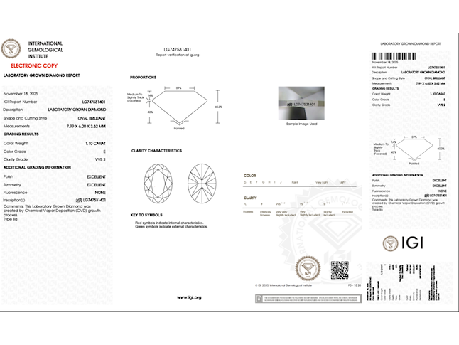 Product: Diamond | Oval | 1.10ct ( IGI Gecertificeerd ) Conditie: Nieuw Specificaties: Diamant: Lab-grown (CVD) Aantal: 1 stuk Slijpvorm: Ovaal Brilliant geslepen Gewicht (carat): 1.10 carat Kleur: E Zuiverheid: VVS2 Polish: Excellent Symmetry: Excellent Fluoresence: None Certificaat: IGI Certificaat nummer: LG747531401 IGI - Laser inscriptie: LG747531401 Conditie: Nieuw Toelichting: De diamant bevat een IGI gegraveerde laser inscriptie met hetzelfde certificaat nummer die in het bijhorend IGI certificaat vermeld staat.