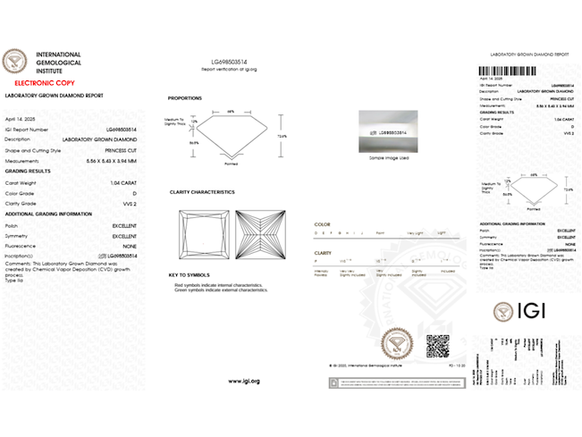 Product: Diamant - Prinscess 1.04 ct - D/VVS2 (IGI gecertificeerd) Materiaal: Labgrown Diamant (CVD) Conditie: Gebruikt Specificaties: - Laboratory grown diamant (CVD) - Princess cut - 1.04 karaat - Kleurgraad: D - Zuiverheidsgraad: VVS2 - Polish: Excellent - Symmetry: Excellent - Fluorescence: None - IGI report number: LG698503514