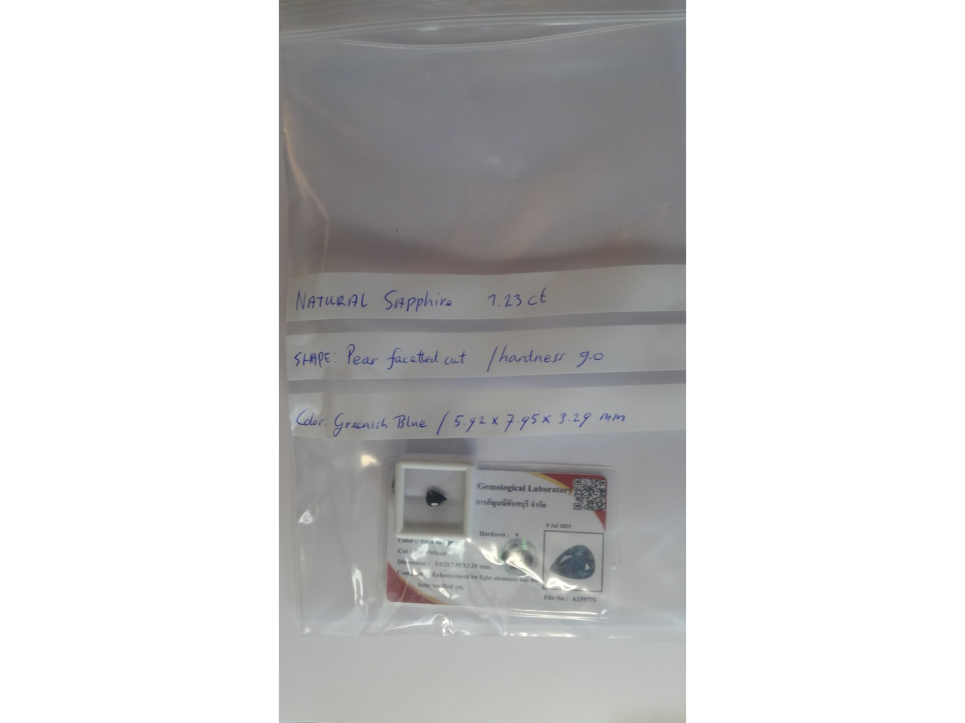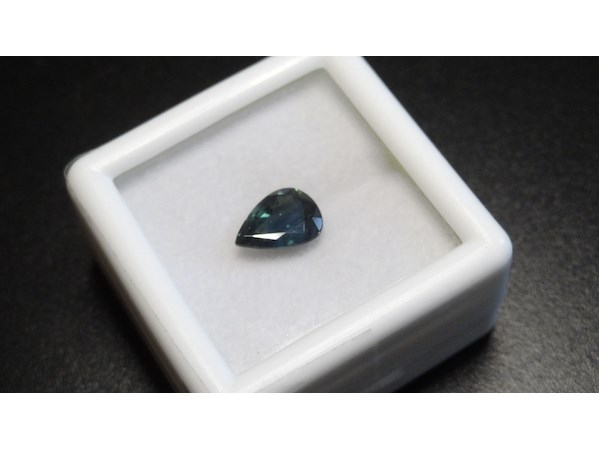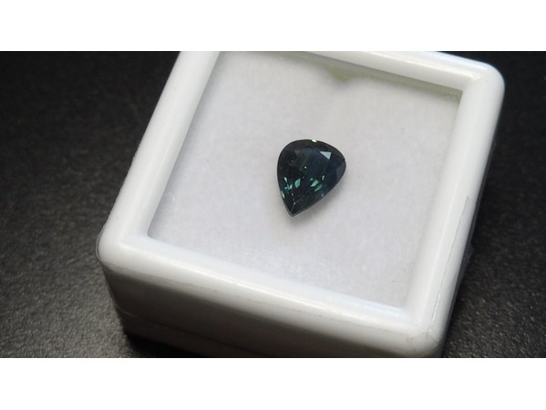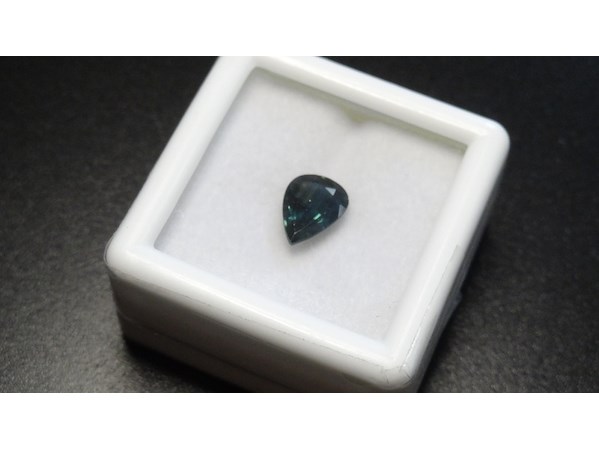 Product: Edelsteen | Natural Sapphire 1.23ct Conditie: Nieuw Specificaties: Natural Sapphire. Weight : 1.23 ct Shape : Pear facetted cut Color : Greenish blue. Clarity : VS Hardness : 9.0 Treatment : Heated only. Dimensions : 5.92 x 7.95 x 3.29 mm. Compleet met GLC rapport. Wordt geleverd in een edelsteendoosje.