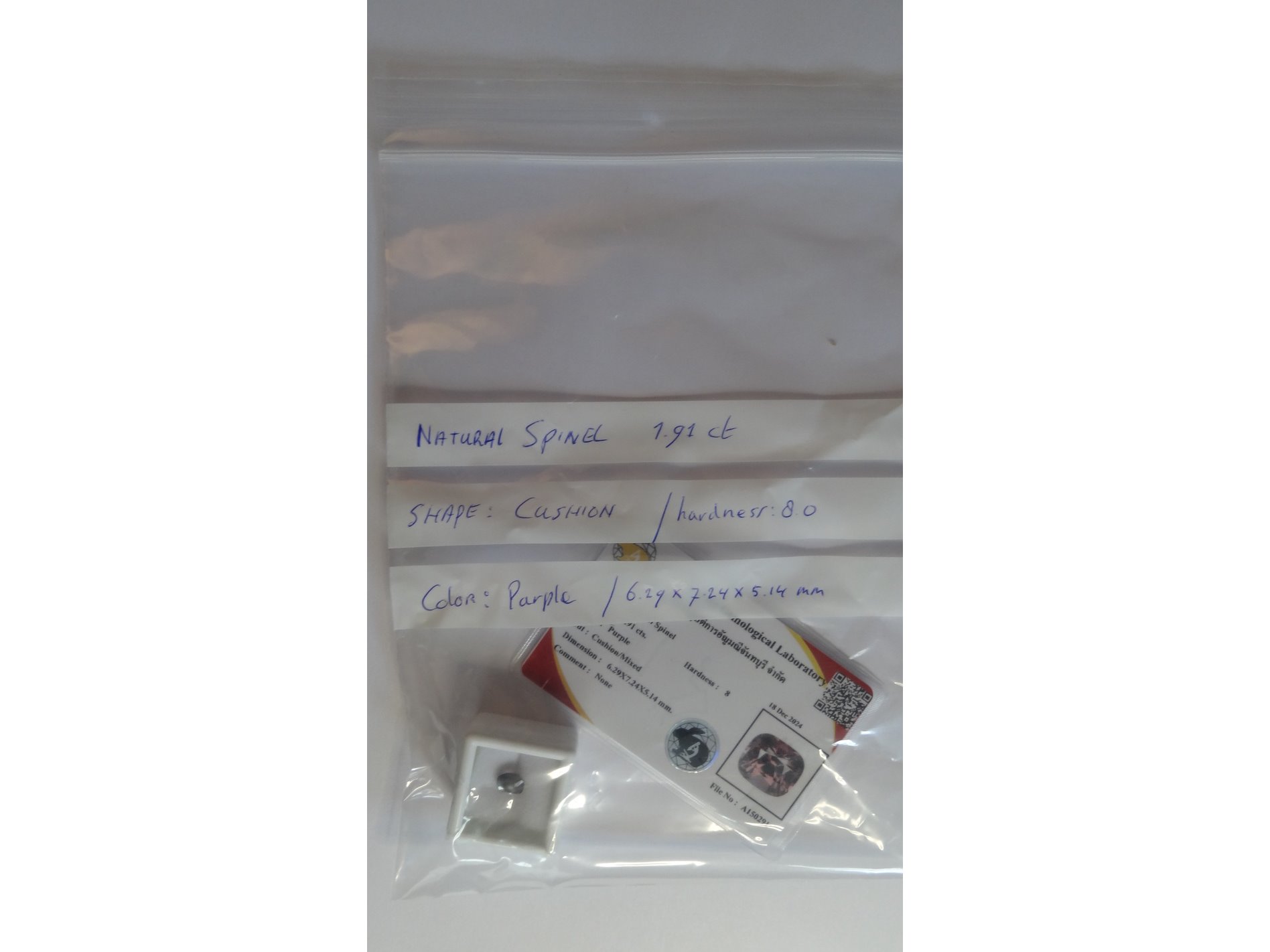 Product: Edelsteen | Natural Spinel 1.91ct Conditie: Nieuw Specificaties: Natural Spinel. Weight : 1.91 ct Shape : Cushion. Color : Purple. Hardness : 8.0 Dimensions : 6.29 x 7.24 x 5.14 mm. Compleet met GLC rapport. Wordt geleverd in een edelsteendoosje.