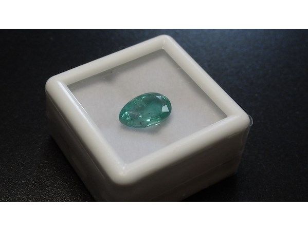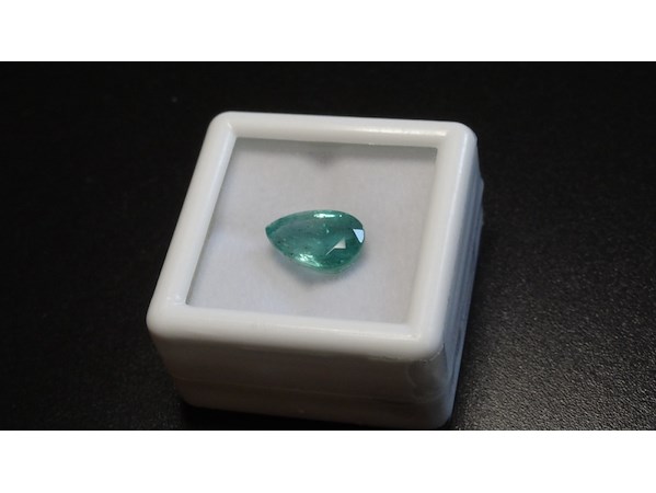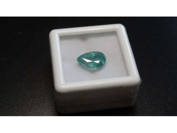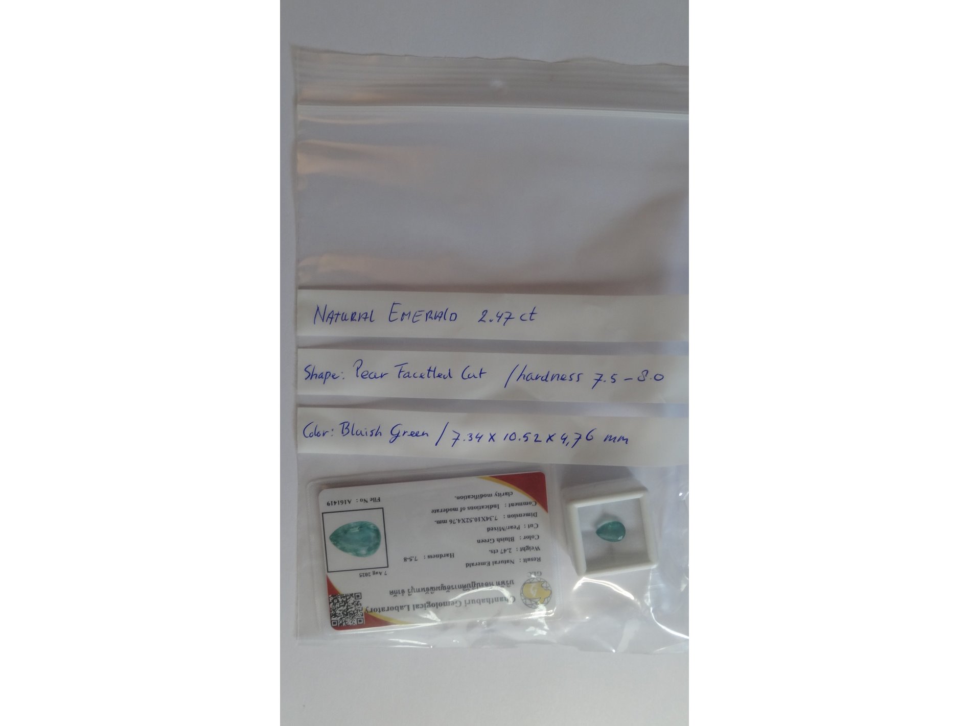 Product: Edelsteen | Natural Emerald 2.47ct Conditie: Nieuw Specificaties: Natural Emerald. Weight : 2.47 ct Shape : Pear facetted cut. Color : Bluish green. Clarity : I1 Hardness : 7.5/8.0 Treatment : Oil Dimensions : 7.34 x 10.52 x 4.76 mm. Compleet met GLC rapport. Wordt geleverd in een edelsteendoosje.