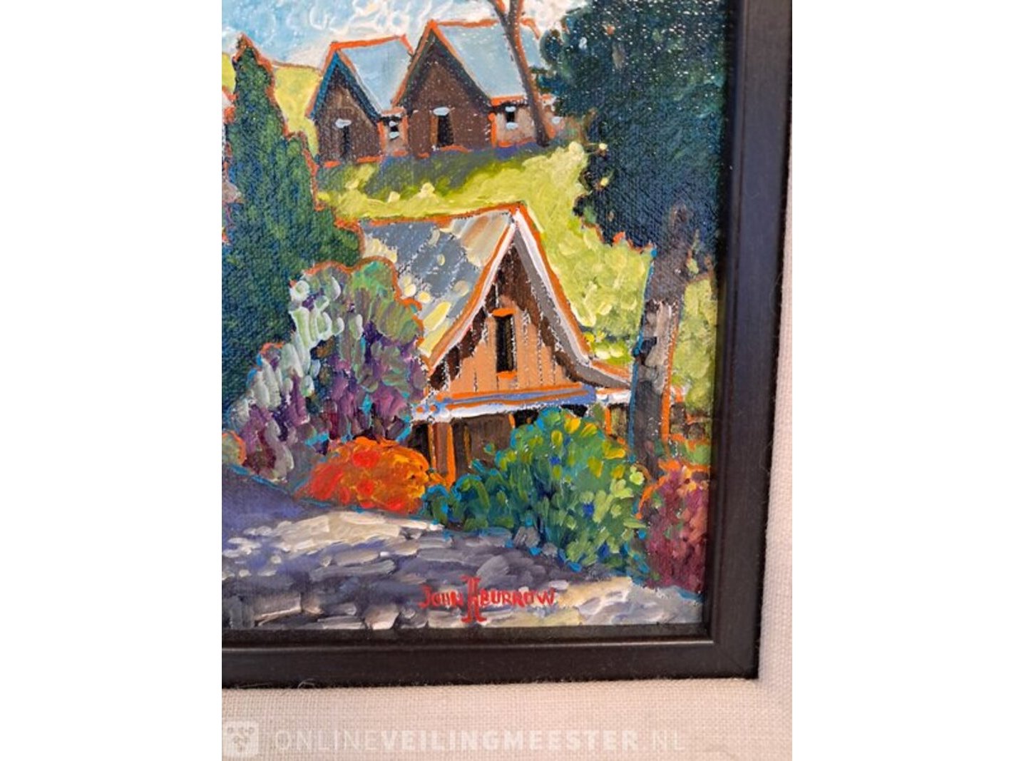 Product: John H Burrow (1955 - ) 'Walk to the Pickers Snacks' Conditie: Gebruikt Specificaties: Ohn H Burrow (1955 - ) 'Walk to the Pickers Snacks' Fineart. Olieverf op doek in zwart frame. Maten: ca 45,5h x 51b cm Dagmaat (zichtmaat): 20h x 24,5b cm John Burrow werd in 1955 geboren in Webster, Massachusetts. Zijn moeder hield van tekenen en schilderen en zijn vader had een carrière als meesterdrukker. Johns jeugd bestond uit meest buitenactiviteiten in Oost-Canada en de koloniale staten van New England. John deelt zijn liefde voor de natuur met anderen via zijn werk. Op 12-jarige leeftijd won John zijn eerste kunstwedstrijd in de Boston Globe. Na het afronden van de middelbare school in Massachusetts zette John zijn artistieke bezigheden voort aan de Utah State University en het Los Angeles Art Center, waar hij werkte in commerciële kunst en kunstopleiding. Door zijn universitaire opleiding kwam John in contact met enkele van Amerika's meest gerenommeerde kunstenaars in de Amerikaanse kunstwereld van vandaag. Johns acryl- en olieverfschilderijen zijn altijd helder, vol kleur en doordrenkt met een gevoel van vreugde en speelsheid. Wanneer mensen zijn schilderijen voor het eerst zien, zeggen ze vaak hoe goed zijn werk hen doet voelen. Tegenwoordig worden Johns kunstwerken verzameld door zowel bedrijven als privé verzamelingen over de hele wereld. Voor meer info: https://www.burrowfineart.com/ https://theavensgallery.com/artist/john-burrow/