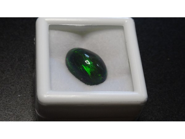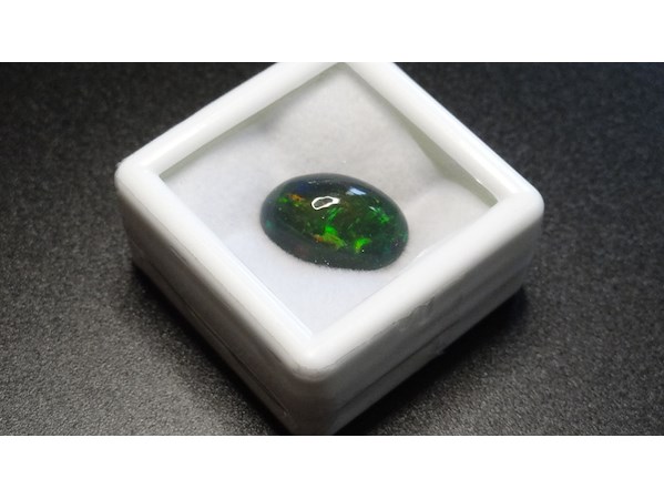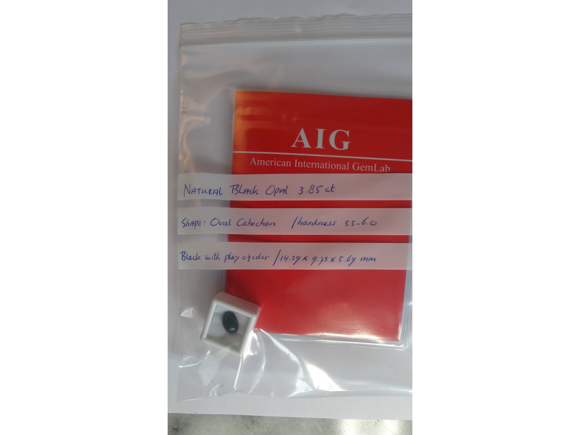 Product: Edelsteen | Natural Black Opal 3.85ct Conditie: Nieuw Specificaties: Natural Black opal. Weight : 3.85 ct Shape : Oval cabochon. Color : Black with play of color. Hardness : 5.5/6.0 Dimensions : 14.39 x 9.73 x 5.69 mm. Compleet met AIG rapport. Wordt geleverd in een edelsteendoosje.