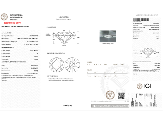 Product: Diamant - rond 2.10 ct - E/VVS2 (IGI gecertificeerd) Materiaal: Labgrown Diamant (CVD) Conditie: Nieuw Specificaties: - Laboratory grown diamant (CVD) - Round brilliant - 2.10 karaat - Kleurgraad: E - Zuiverheidsgraad: VVS2 - Polish: Excellent - Symmetry: Excellent - Fluorescence: None - IGI report number: LG674531933