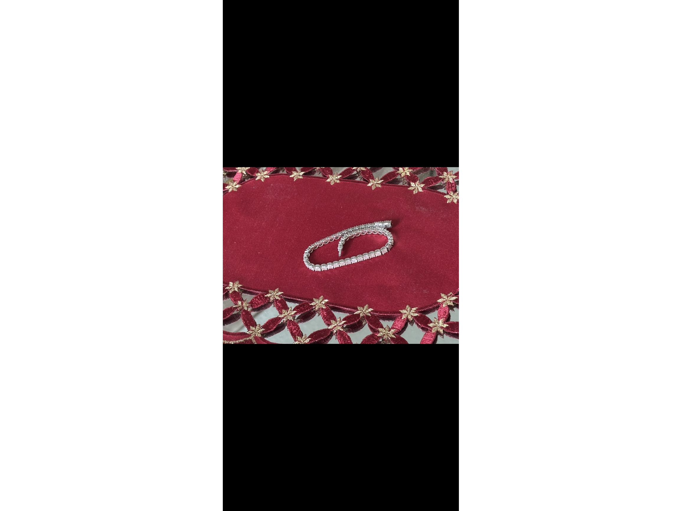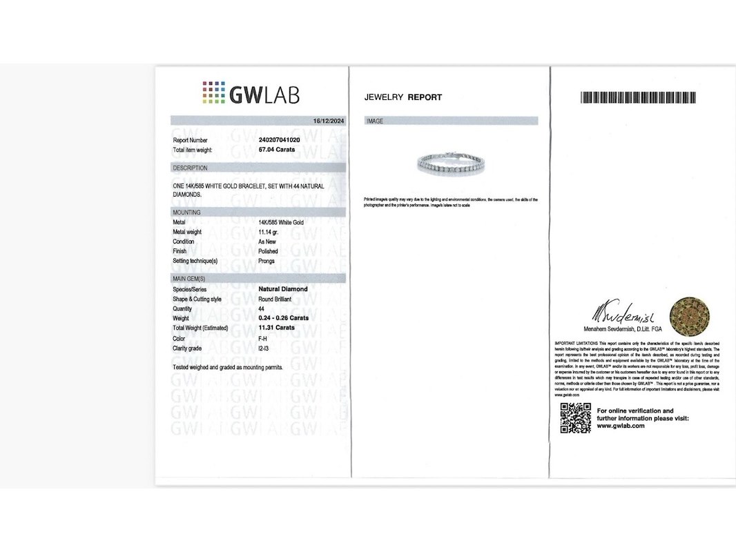Product: Tennisarmband aus 585 Weißgold mit 11.31 ct. natürlichen Diamanten Materiaal: Weißgold Afmeting: 18,3 cm BouwJaar: 16.12.2024 Conditie: Nieuw Specificaties: Dieses elegante Tennisarmband besticht durch seine luxuriöse Ausstrahlung und exzellente Verarbeitung. Gefertigt aus hochwertigem 14K (585) Weißgold, ist es mit 44 natürlichen Diamanten im Brillantschliff besetzt, die gemeinsam ein beeindruckendes Feuer entfalten. Jeder einzelne Diamant wurde sorgfältig ausgewählt und präzise in Krappenfassung eingesetzt, um maximale Brillanz zu gewährleisten. Das Armband zeichnet sich durch seine klassische, zeitlose Eleganz aus – ideal für besondere Anlässe oder als wertvolles Investmentstück. Technische Details laut GW LAB-Zertifikat (Nr. 240207041020 – 16.12.2024): Metall: 14K / 585 Weißgold Metallgewicht: ca. 11.14 g Gesamtkaratgewicht: ca. 11.31ct Anzahl der Diamanten: 44 Stück Schliff: Rund (Brillant) Einzelsteingröße: ca. 0.24 – 0.26 ct Farbe: F–H (Feinweiß bis Weiß) Reinheit: I2-I3 Fassung: Krappenfassung Kondition: neuwertig Zertifikat: GW LAB Jewelry Report (im Lieferumfang enthalten) Zustand: Das Armband befindet sich in hervorragendem, neuwertigem Zustand. Keine sichtbaren Gebrauchsspuren. Die Diamanten funkeln intensiv, das Weißgold ist hochglanzpoliert. Lieferumfang: - Tennisarmband aus 14K Weißgold mit 44 Diamanten - Original GW LAB-Zertifikat (authentifiziert)