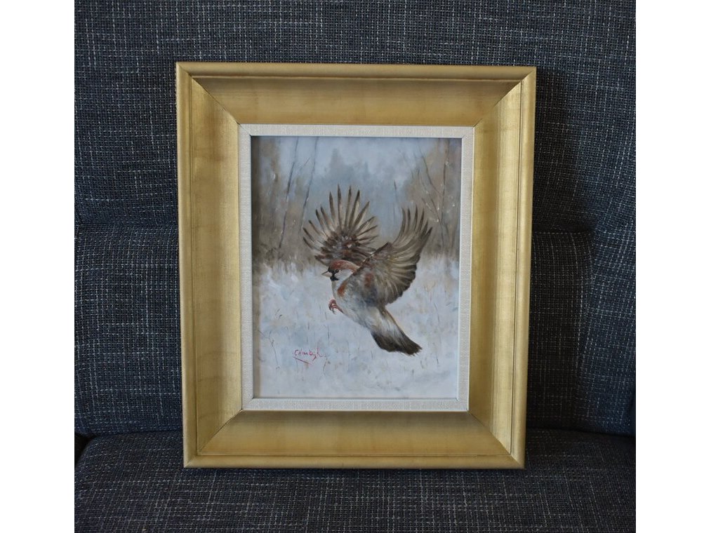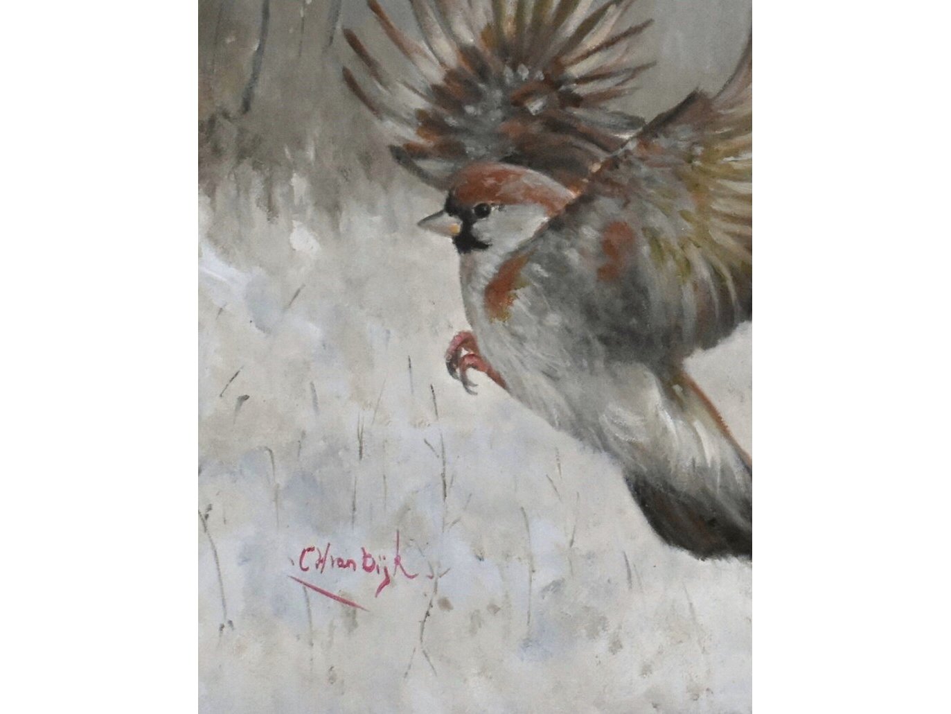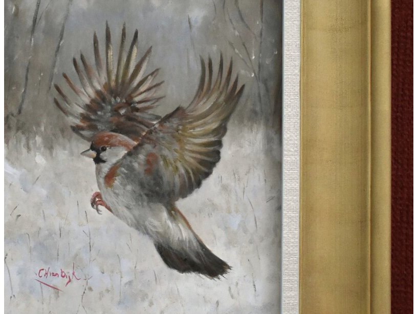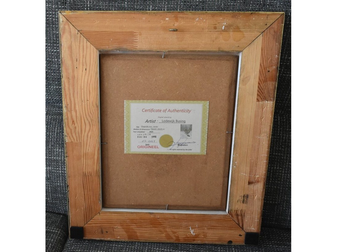 Product: Lodewijk Busing (aka C.H.van Dijk) - "Mus in winterlandschap" Conditie: Gebruikt Specificaties: Schilderij van Lodewijk Busing, Maastricht 1965, "Mus in winterlandschap" Gesigneerd onder pseudoniem: C H van Dijk Met certificaat. Lodewijk Busing geboren te Maastricht(1965) maar woont alweer het grotendeels van zijn leven in de bollenstreek , Hij haalt zijn inspiratie uit zijn omgeving tijdens zijn wandelingen in zijn bosrijke omgeving , Kleuren en de intensiteit van het licht toch met een licht warme tint probeert hij in zijn werken op te zetten . Zijn meest geliefde thema is toch het schilderen van de prachtige vogels uit het mooie Hollandse landschap Hij signeert zijn werken meestal met zijn bekendere pseudoniem CH van Dijk zo ook dit schilderij is gesigneerd Het schilderij heeft een mooie licht goudkleurige lijst Het werk exclusief de lijst meet op paneel 24x30 cm Schilderij op achterzijde paneel voorzien van een certificaat ondertekend en gesigneerd door de schilder.