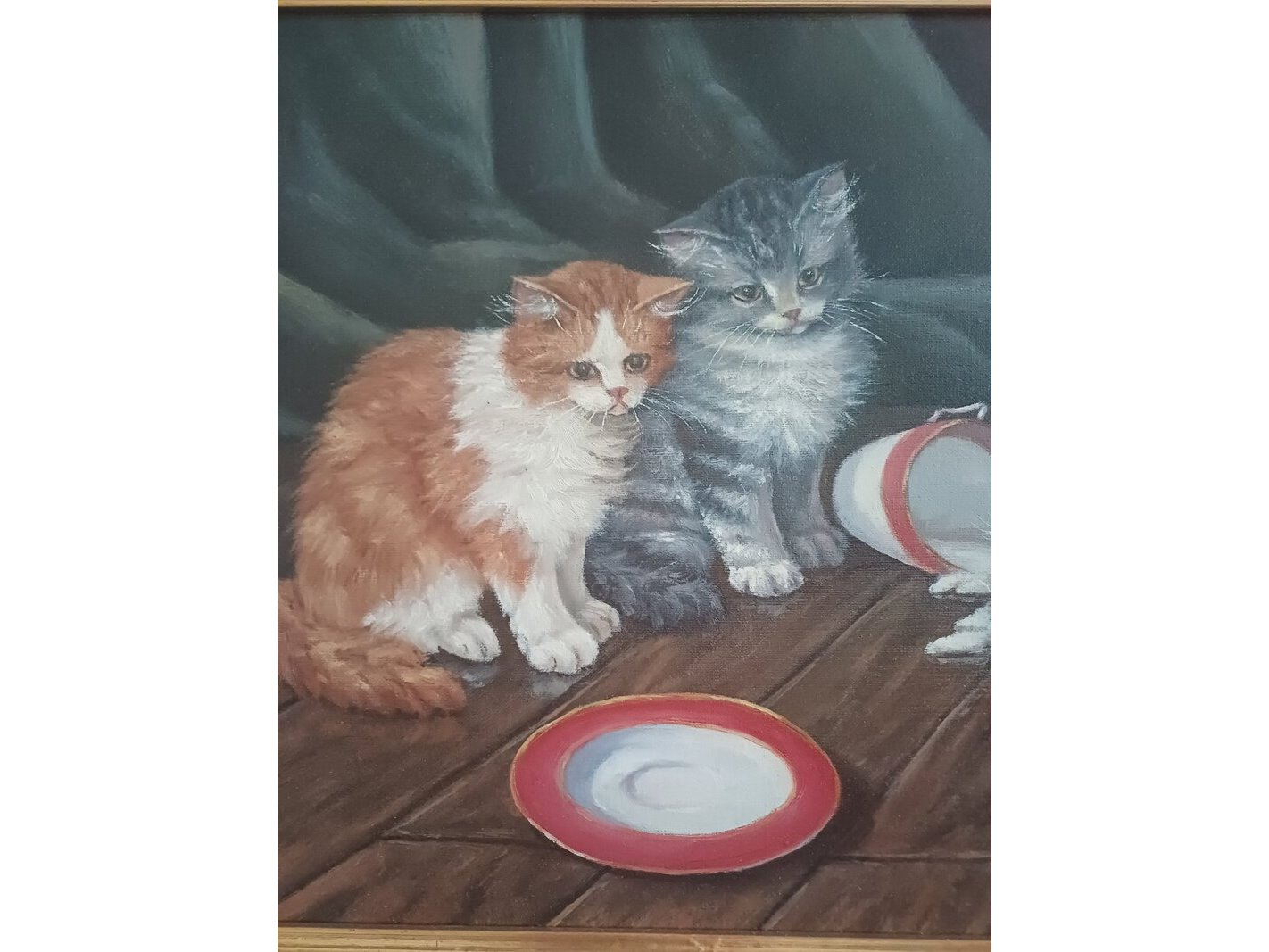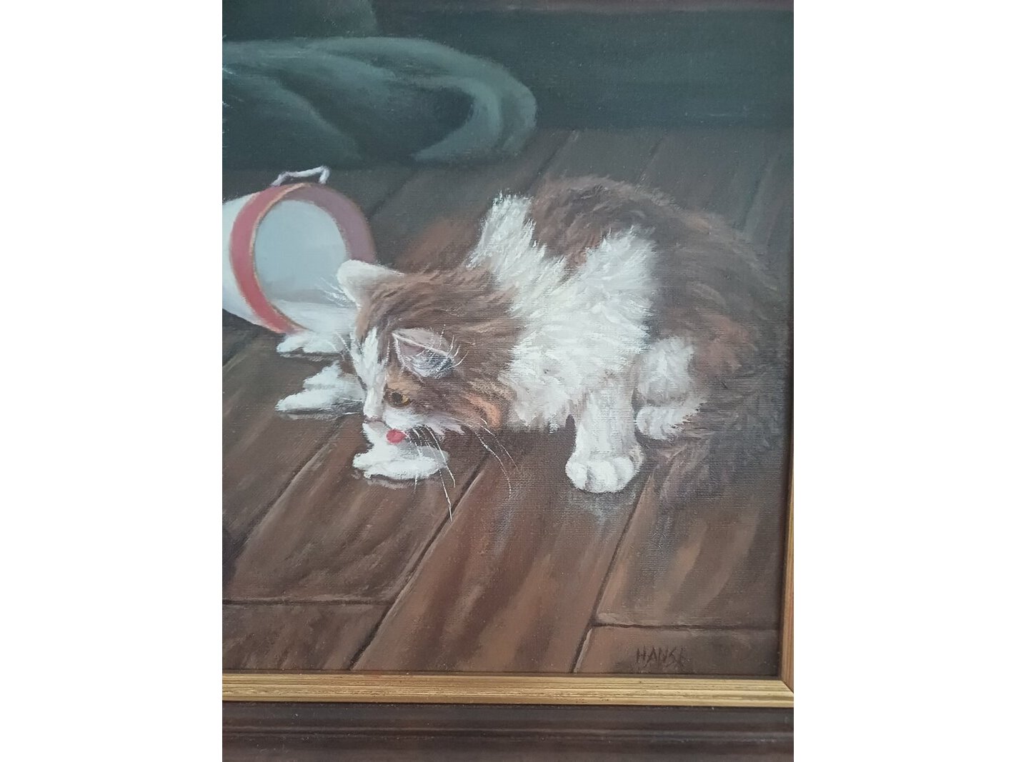 Product: Hans E (Hans Esveldt) - Kittens en slagroom Conditie: Gebruikt Specificaties: Hans Esveldt "Kittens en slagroom" Schilderij Olieverf op doek gesigneerd Hans E) Maten: ca 56 x 45 cm, dagmaat(zichtmaat) ca 31 x 42 cm