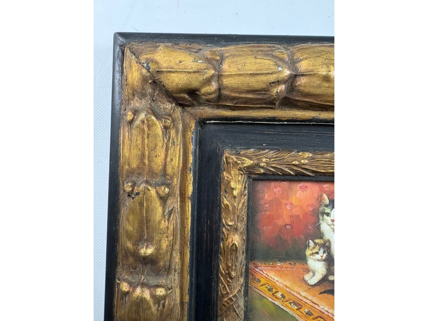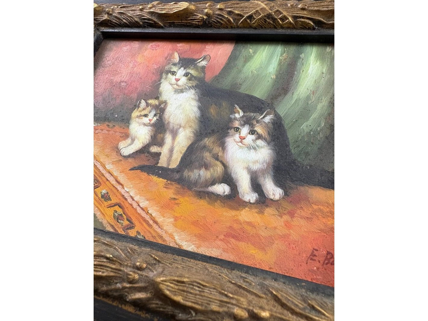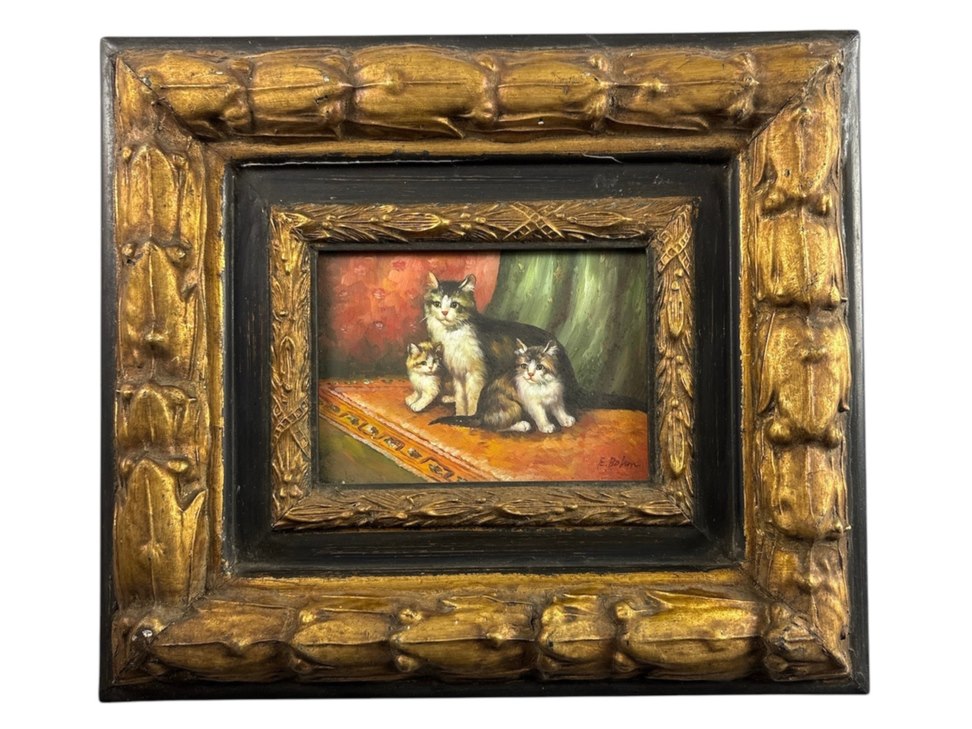 Product: Europese school (1800-1850) - E Bohm Moederkat met kittens Conditie: Gebruikt Specificaties: Olieverf op canvas Maten: ca 33x38 cm Dagmaat (zichtnaat) ca 19x24 cm Lijst: Gold plated wood by Biggs and Sons (London)