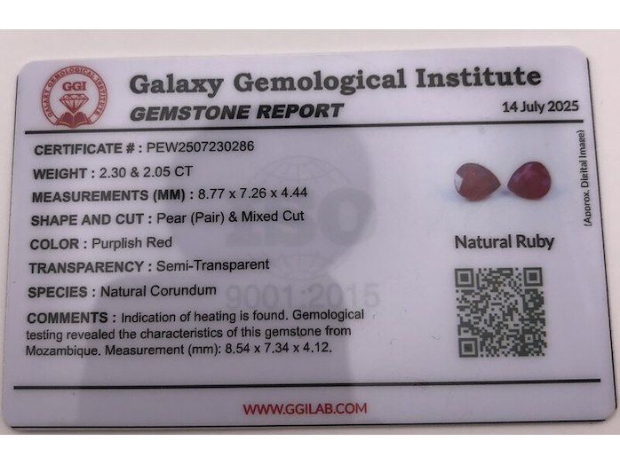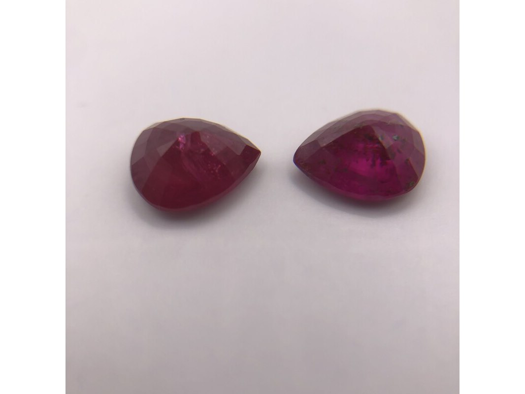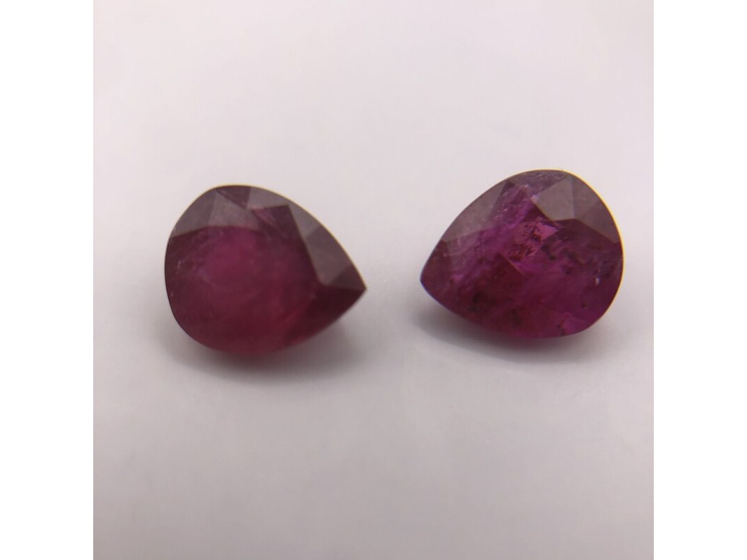 Product: Robijn Kleur: Rood Materiaal: Corundum Afmeting: 8.7x7.3x4.4 and 8.5x7.32x4.1 Conditie: Gebruikt Specificaties: Edelsteen: Robijn Aantal: 2 stuks Vorm: Peer Slijpvorm: Trapsgewijs Gewicht (karaat): 2,3 + 2,05 = 4,35 Afmetingen (mm): 8,7 x 7,3 x 4,4 en 8,5 x 7,32 x 4,1 Kleur: Paarsrood Beschrijving: Een bijpassend paar robijnen, perfect voor oorbellen.