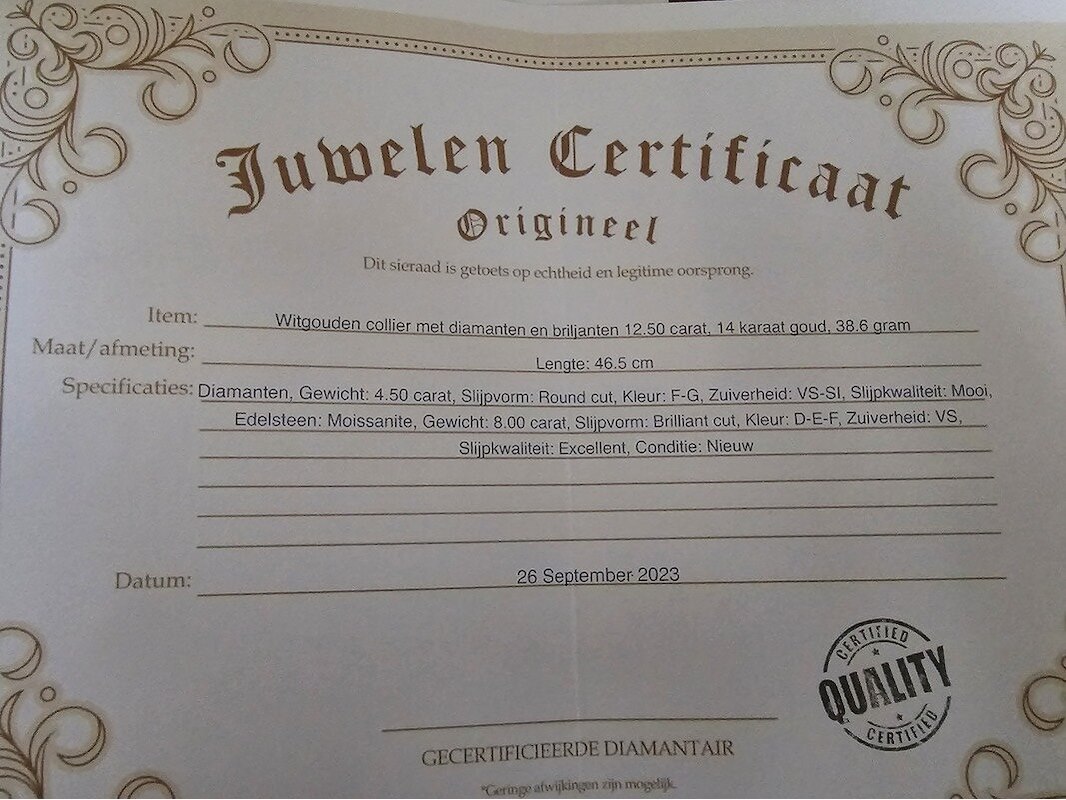 Product: Witgouden Collier met diamanten en briljanten 12.50 karaat, 14 karaat wit goud 38,6 gram Materiaal: Goud en diamanten en briljanten Afmeting: 46,5 cm BouwJaar: 2023 Conditie: Nieuw Specificaties: Diamanten Gewicht: 4.50ct Slijpvorm: Round Cut Kleur: F-G Zuiverheid: VS-SI Slijpkwaliteit: Mooi Edelsteen: Moissanite Gewicht: 8.00ct Slijpvorm: Brilliant Cut Kleur: D-E-F Zuiverheid: VS Slijpkwaliteit: Excellent Conditie: Nieuw