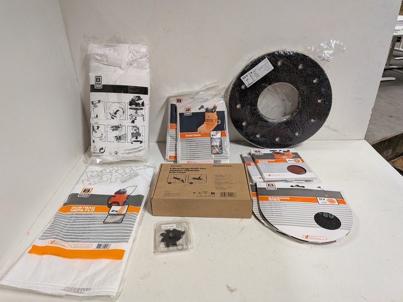 Merk: O.a. B-Prof, Kärcher Product: Assortiment schuurschijven, doekensetten en dustbags Conditie: Nieuw Specificaties: Bestaande o.a. dustbags, doekensetten voor stoomreinigers, schuurschijven, etc.