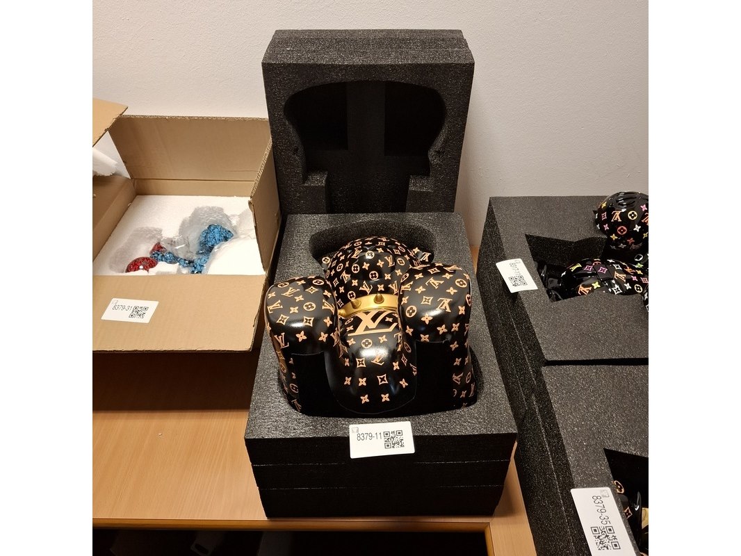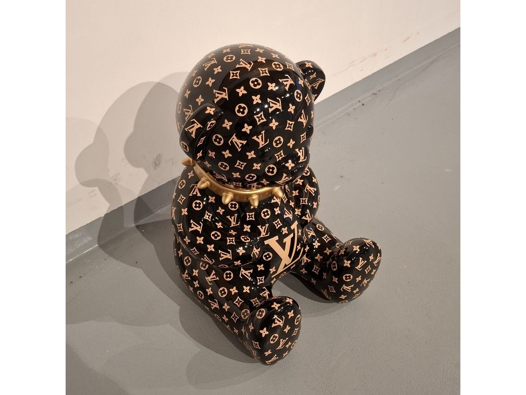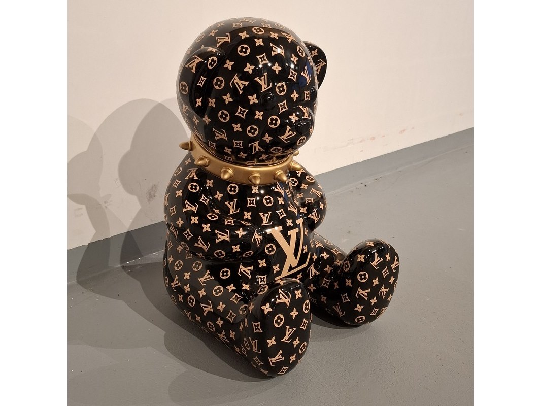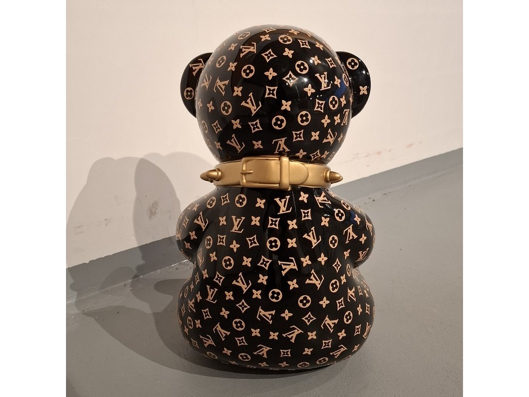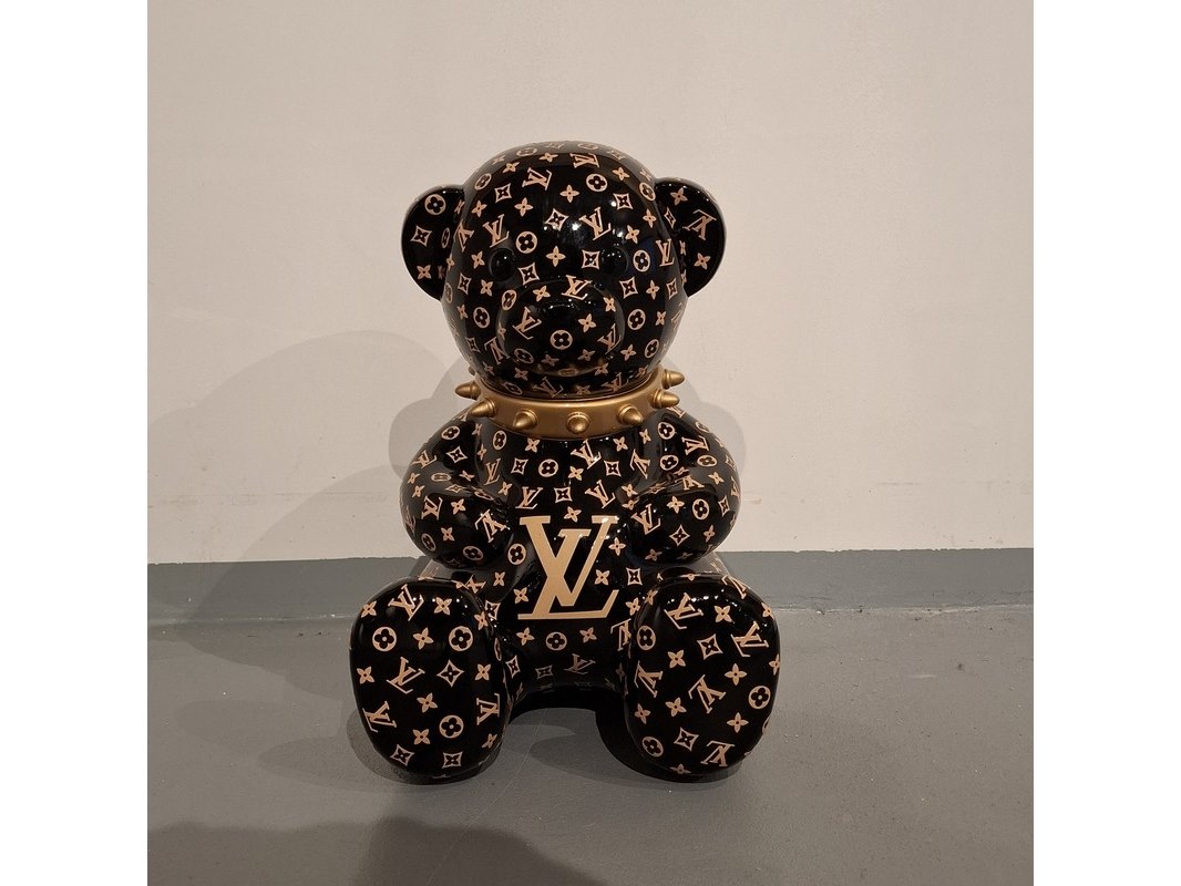 Product: Bad beer beeld Kleur: Zwart Materiaal: Fiberglass Afmeting: 40cm hoog, 30cm breed Conditie: Gebruikt Specificaties: Zwarte beer met Louis Vuitton print