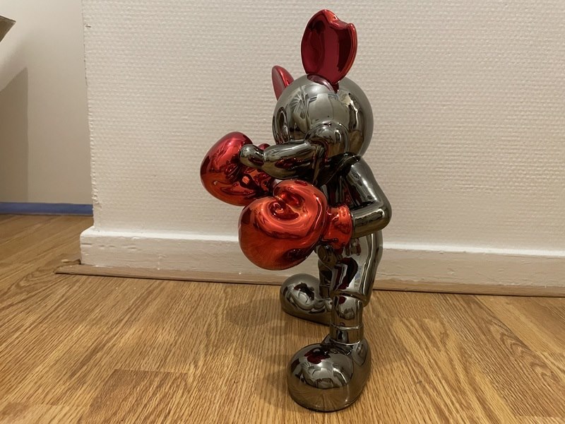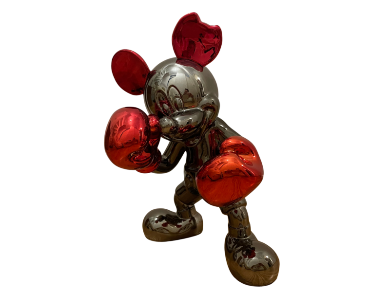 Product: Mickey Mouse Knock-Out! pop art beeld Materiaal: Gemalen steen gemengd met hars Afmeting: 33cm hoog, 25cm breed Conditie: Nieuw