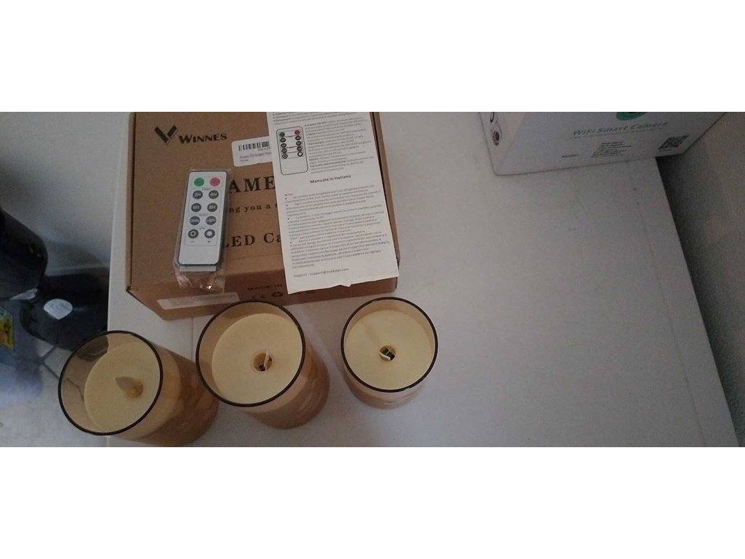 Product: Set van 3 elektronische sfeer kaarsen Conditie: Nieuw Specificaties: 94 sets van 4 elektronische sfeer kaarsen. Meest met afstandsbediening. Zitten nieuw verpakt in setjes van 4 per doos Dit komt uit een ongecontroleerde giga partij retourgoederen van een online seller
