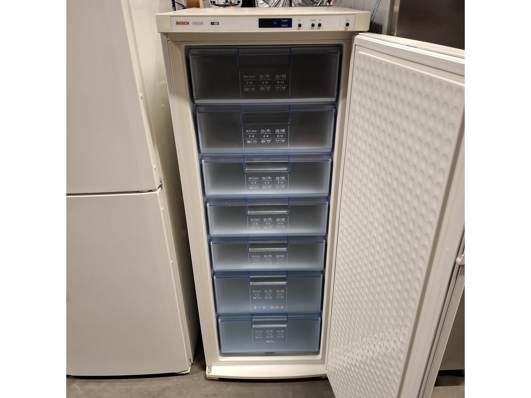 Merk: Bosch Product: 7 lades vriezer Kleur: Wit Afmeting: 155x60x60 Conditie: Gebruikt Specificaties: 7 lades vriezer A+ Exclusiv Met kleine display bovenin. Werkend getest!