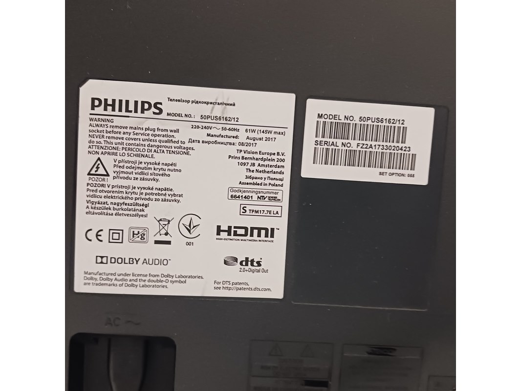 Merk: Philips Product: 4K Ultra HD televisie Afmeting: 50", 3840x2160 (4K) BouwJaar: 2017 Specificaties: Op voet, inclusief afstandsbediening, inclusief Apple TV A1625
