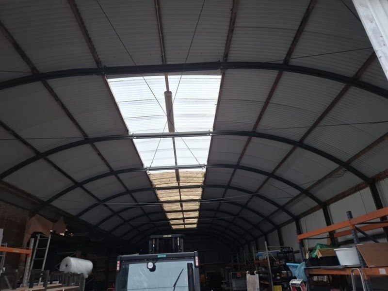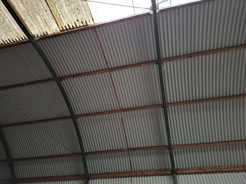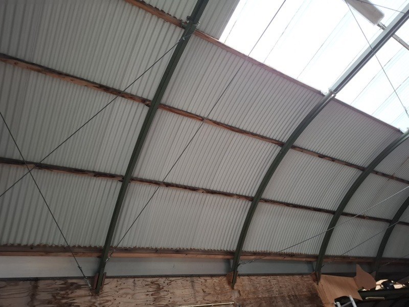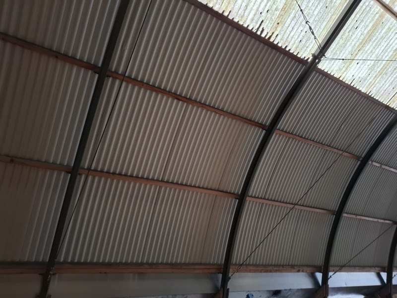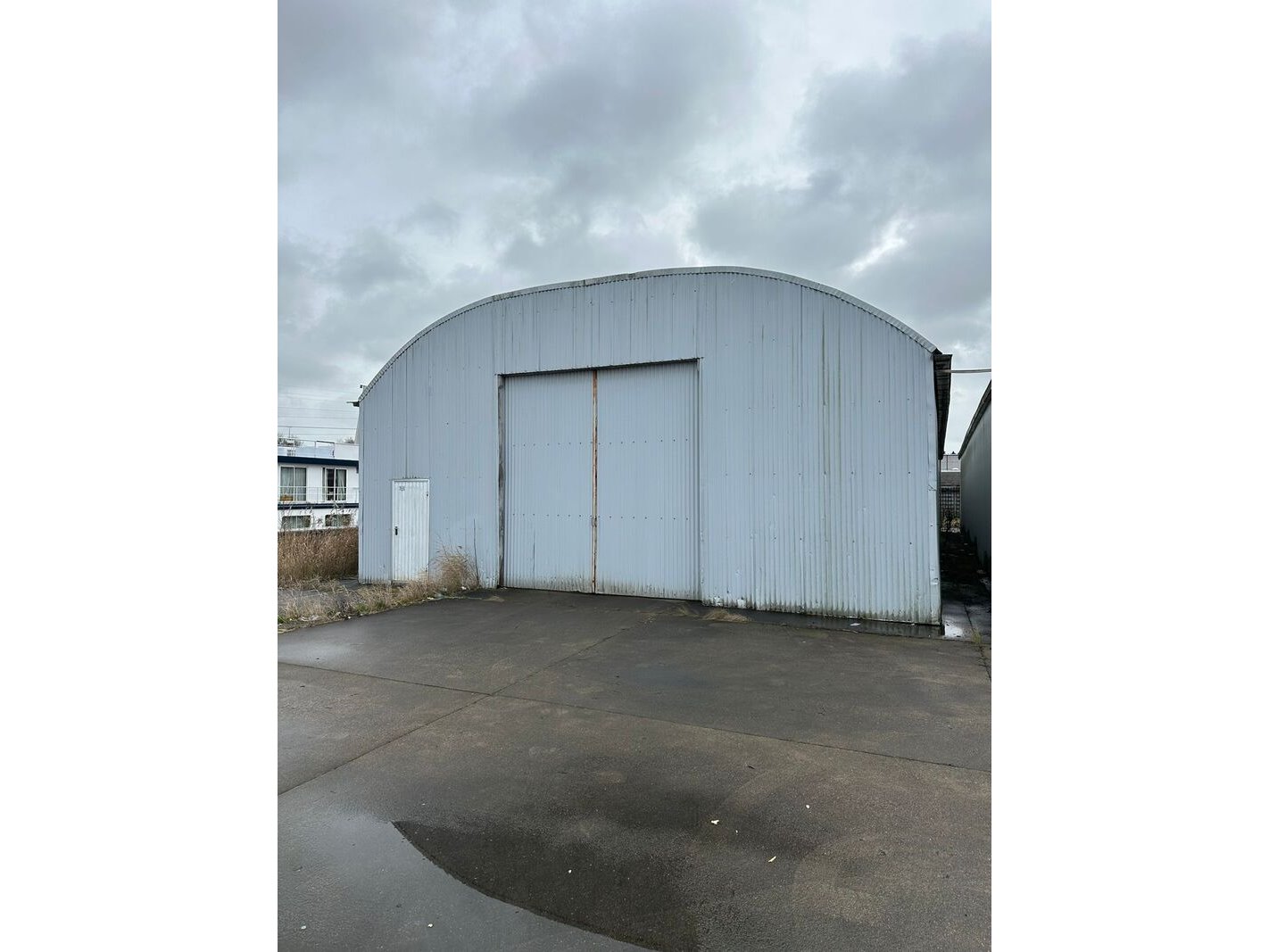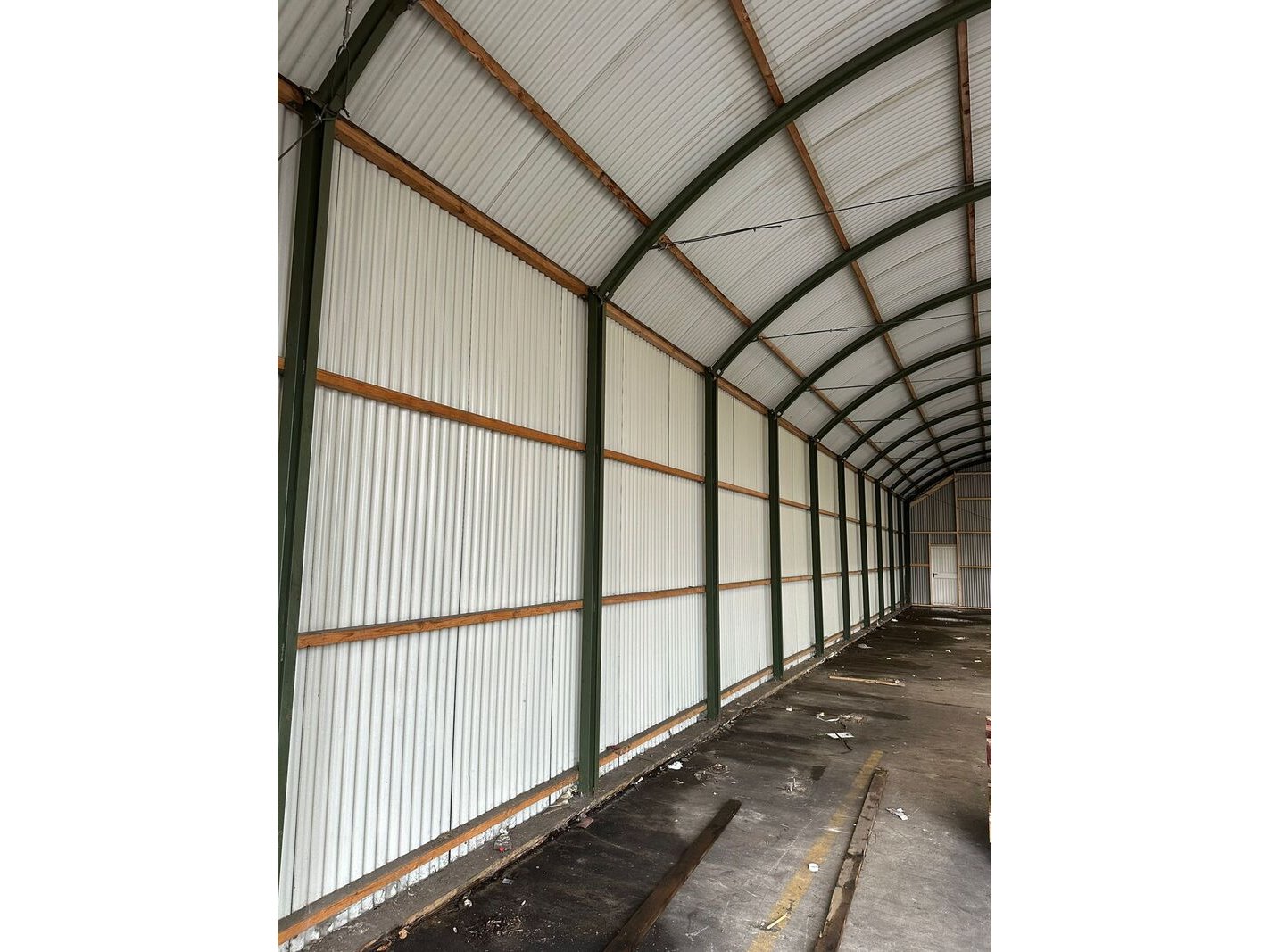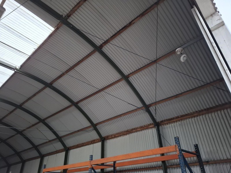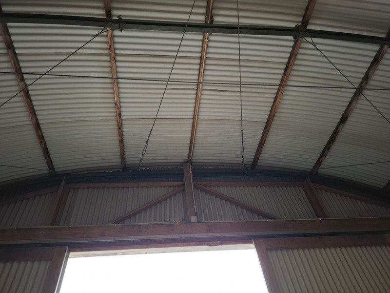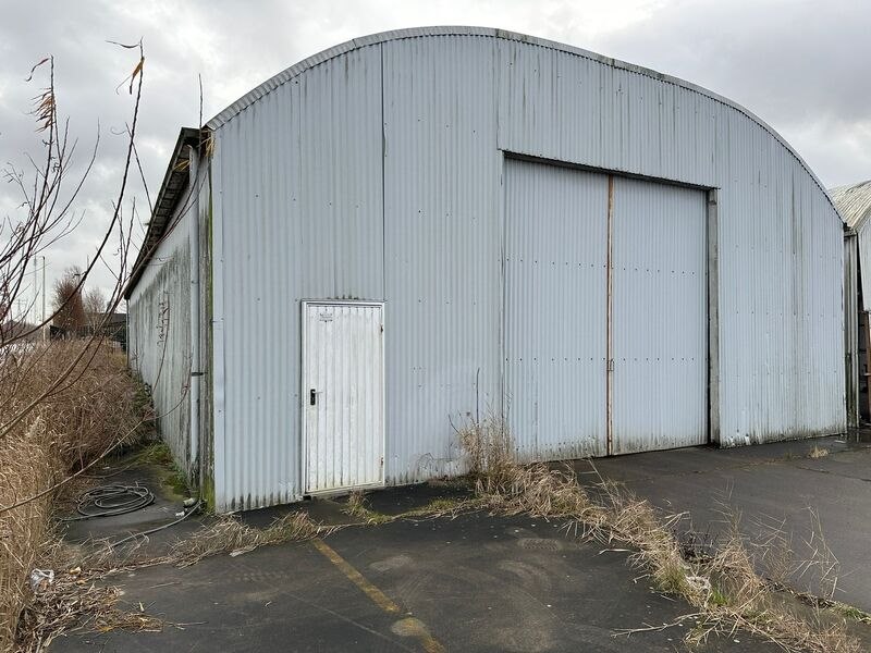 Product: (Externe locatie Groningen) Romneyloods Afmeting: Lxbxh ca. 27,64 x 9,60 x 5,60 meter Conditie: Gebruikt Specificaties: Materiaal: Metalen gevelplaten, metaal en houten spanten.