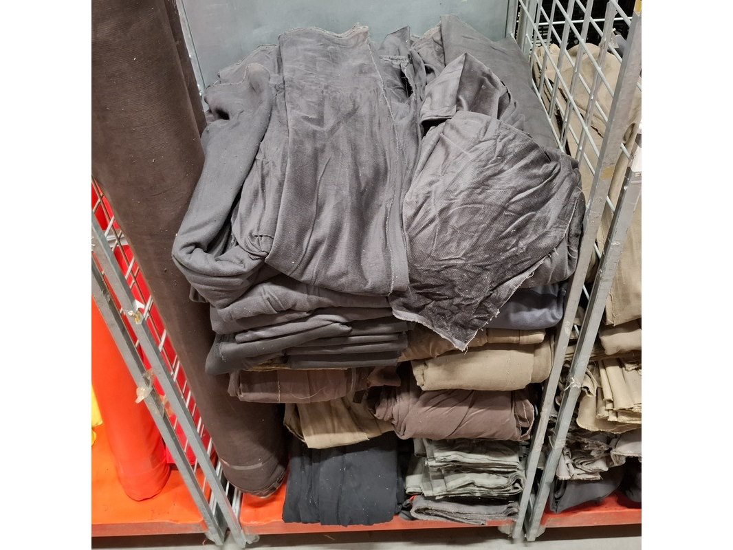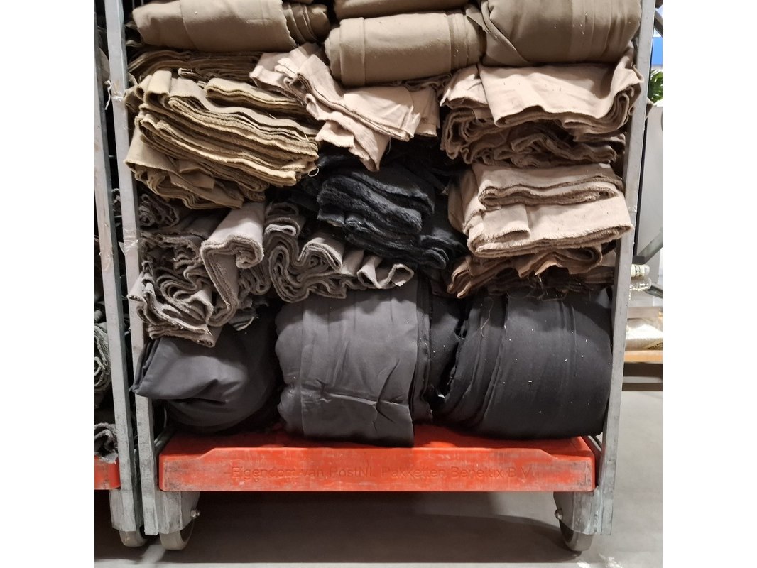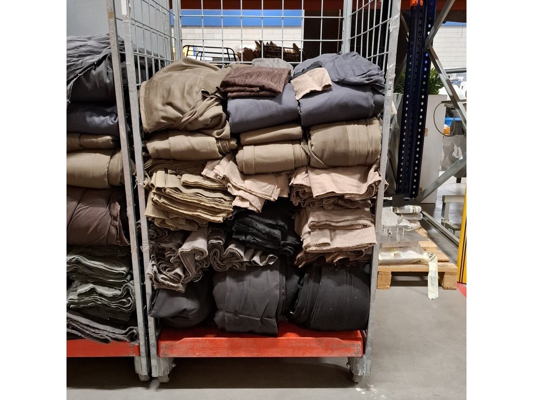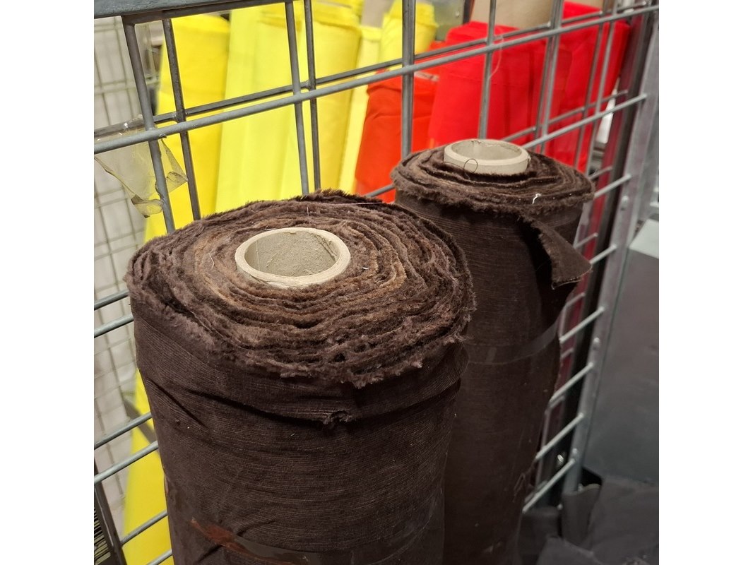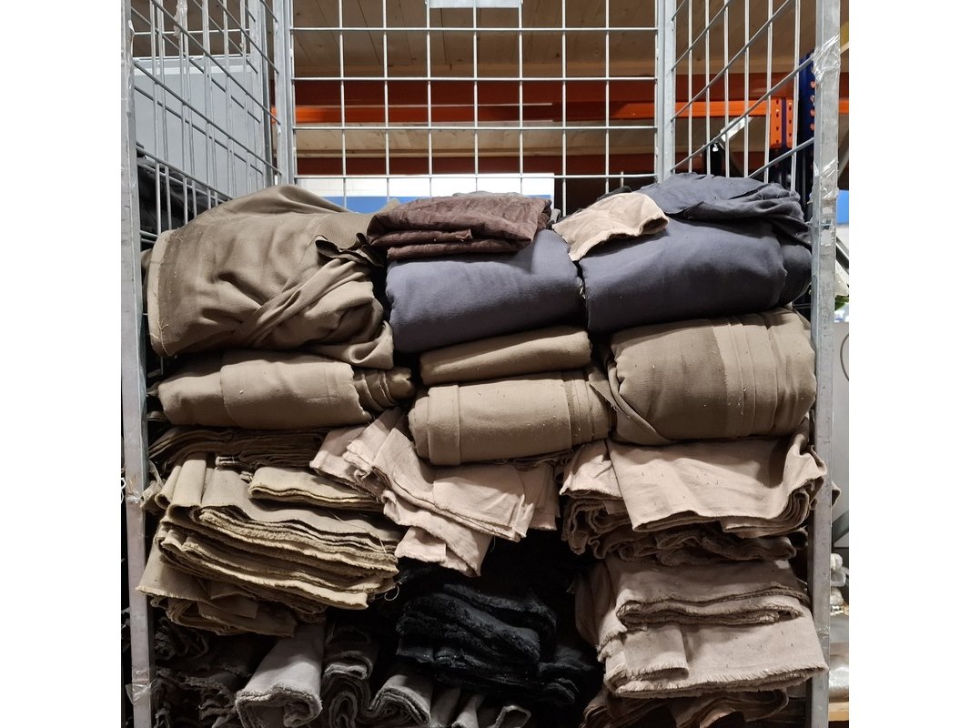 Product: Ribfluweel, coupons en confectiedelen Specificaties: Kleuren: Bruin, zwart, groen en beige Breedte ca. 150 cm Totale hoeveelheid ca. 450 kg