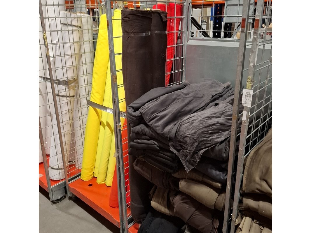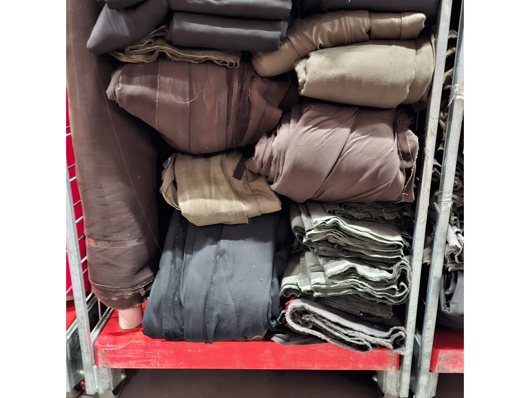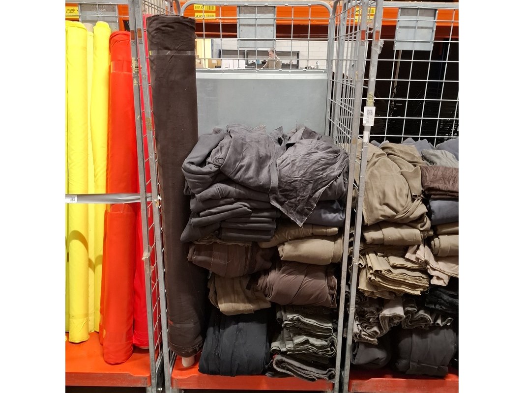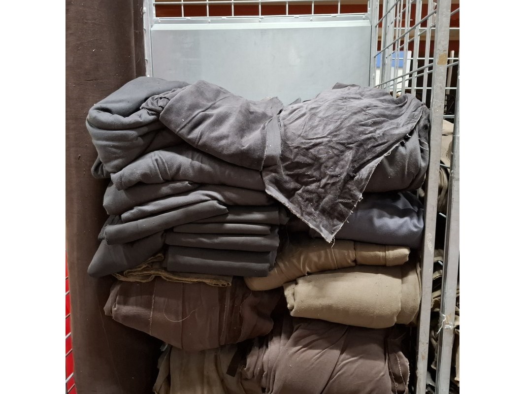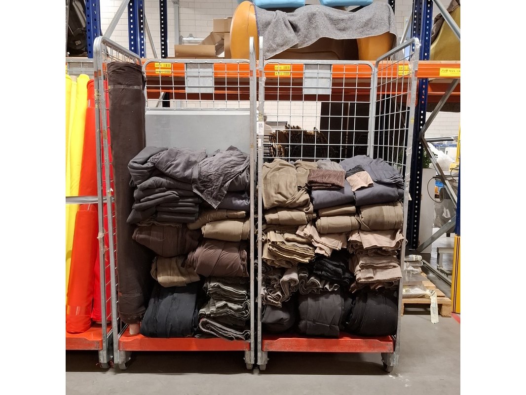 Product: Ribfluweel, coupons en confectiedelen Specificaties: Kleuren: Bruin, zwart, groen en beige Breedte ca. 150 cm Totale hoeveelheid ca. 450 kg