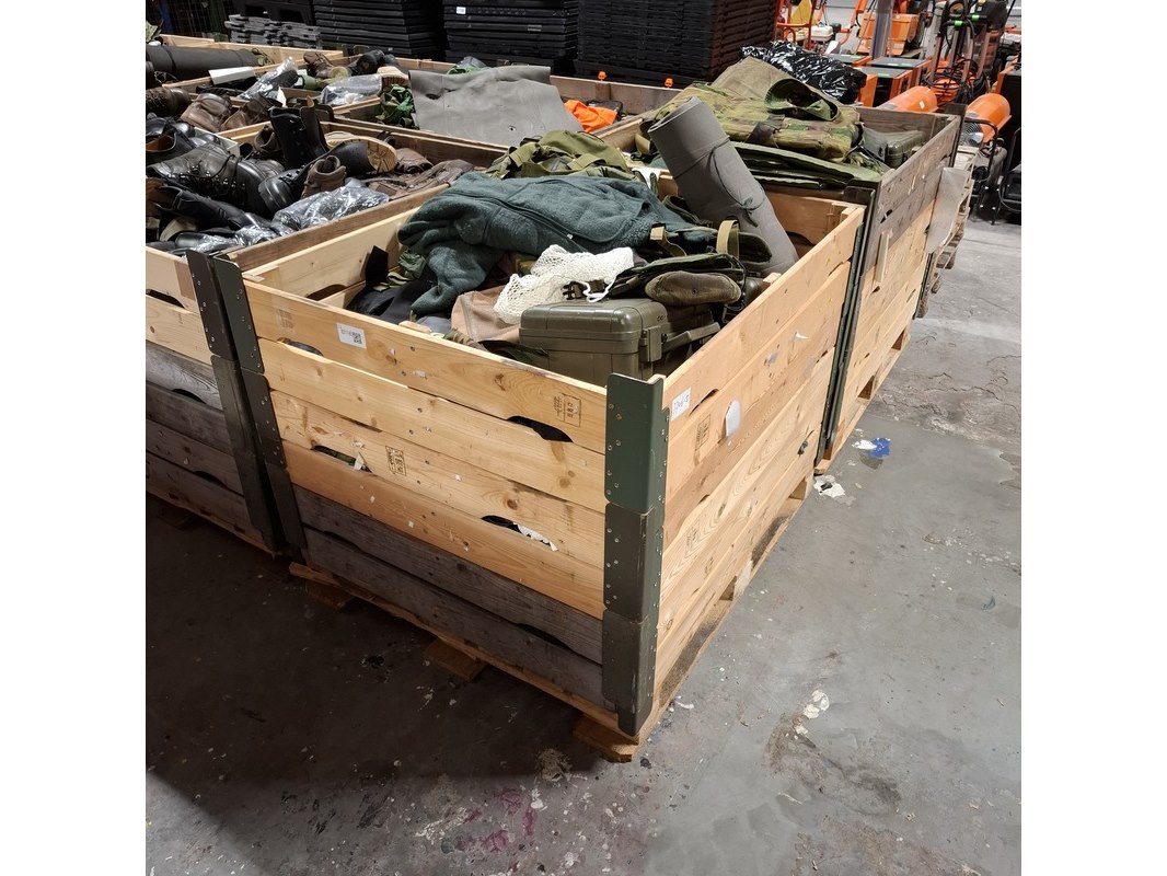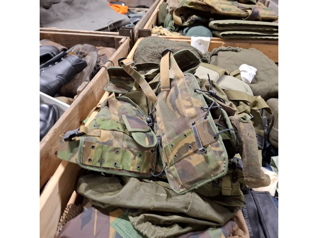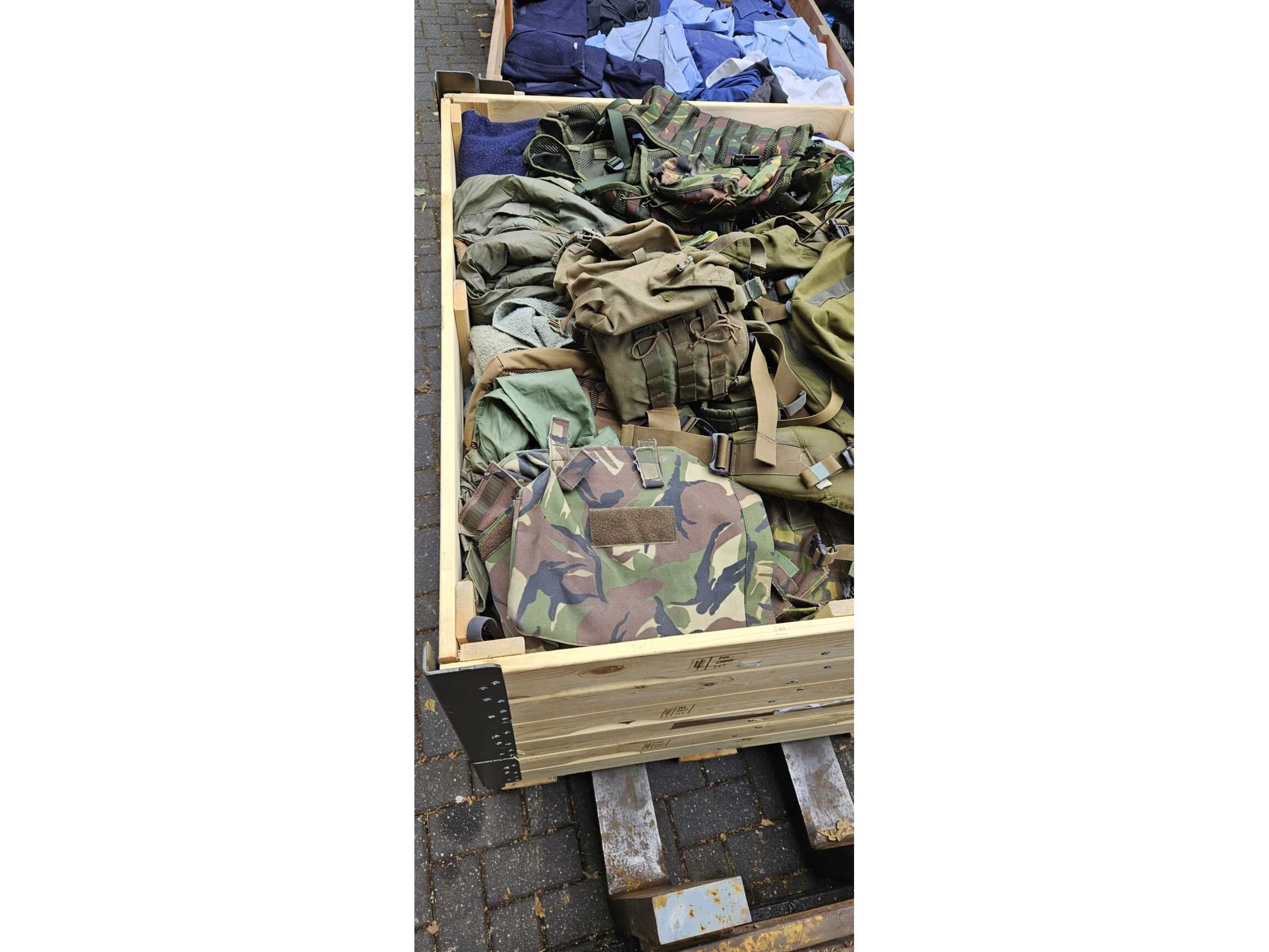 Merk: Woodland KPU KL Product: Persoonlijke uitrusting en kleding defensie Afmeting: van alles Conditie: Gebruikt Specificaties: Bestaande uit 1 palletbox ongesorteerde artikelen