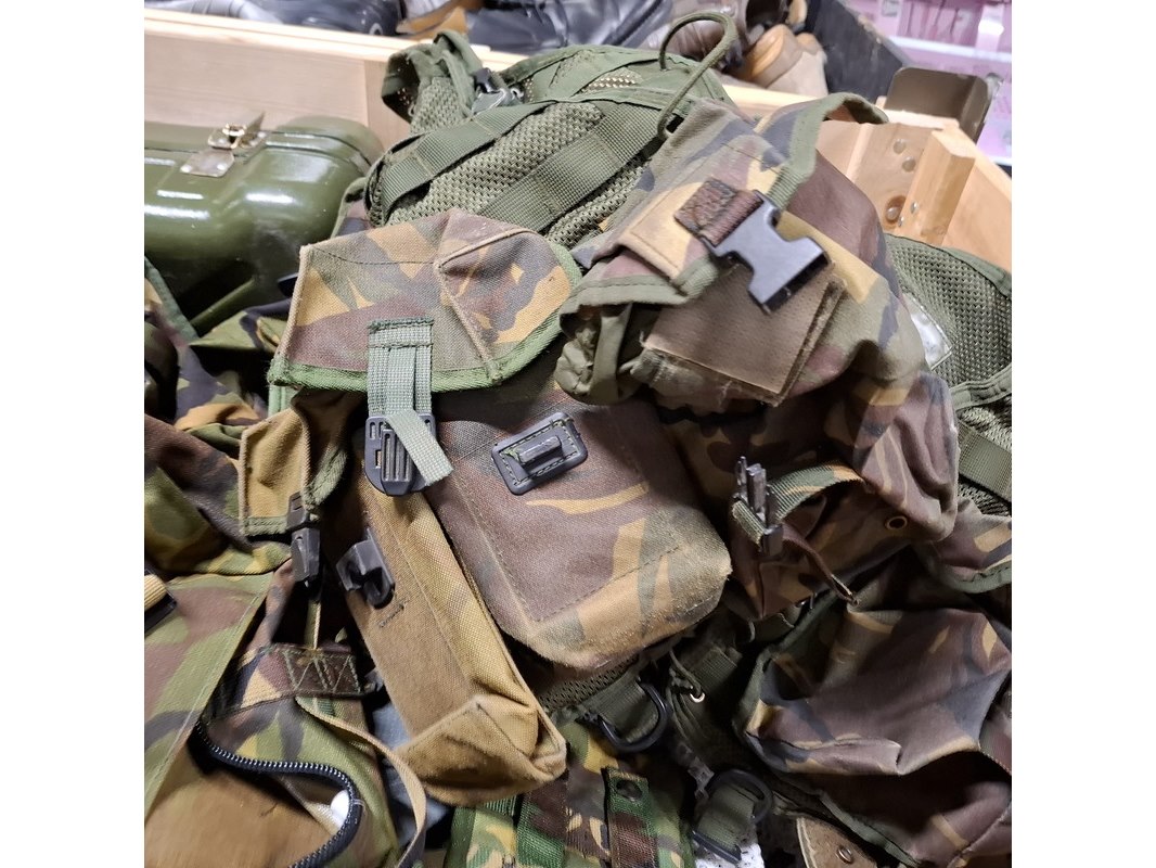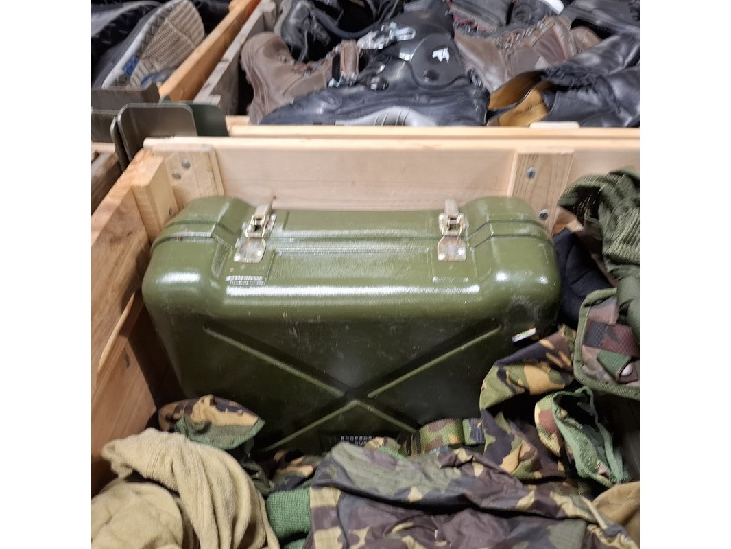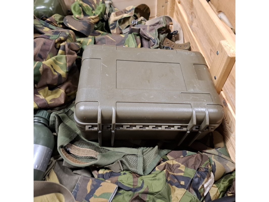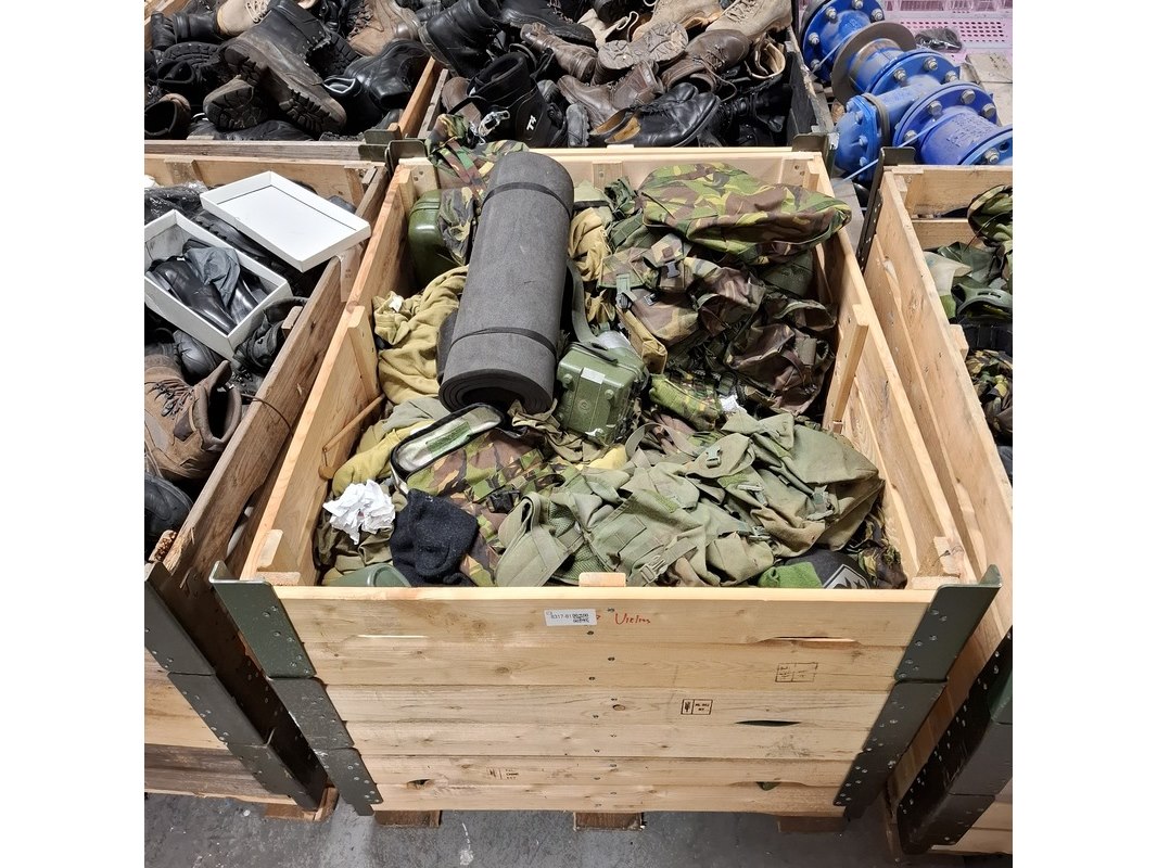 Merk: Woodland KPU KL Product: Persoonlijke uitrusting en kleding defensie Afmeting: van alles Conditie: Gebruikt Specificaties: Bestaande uit 1 palletbox ongesorteerde artikelen Inclusief palletbox