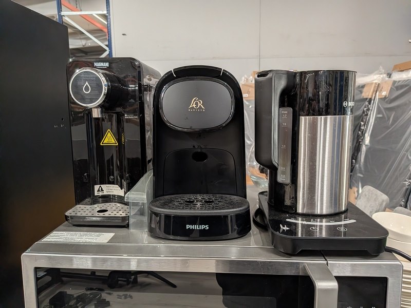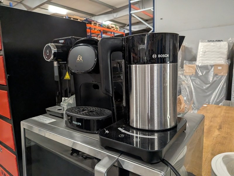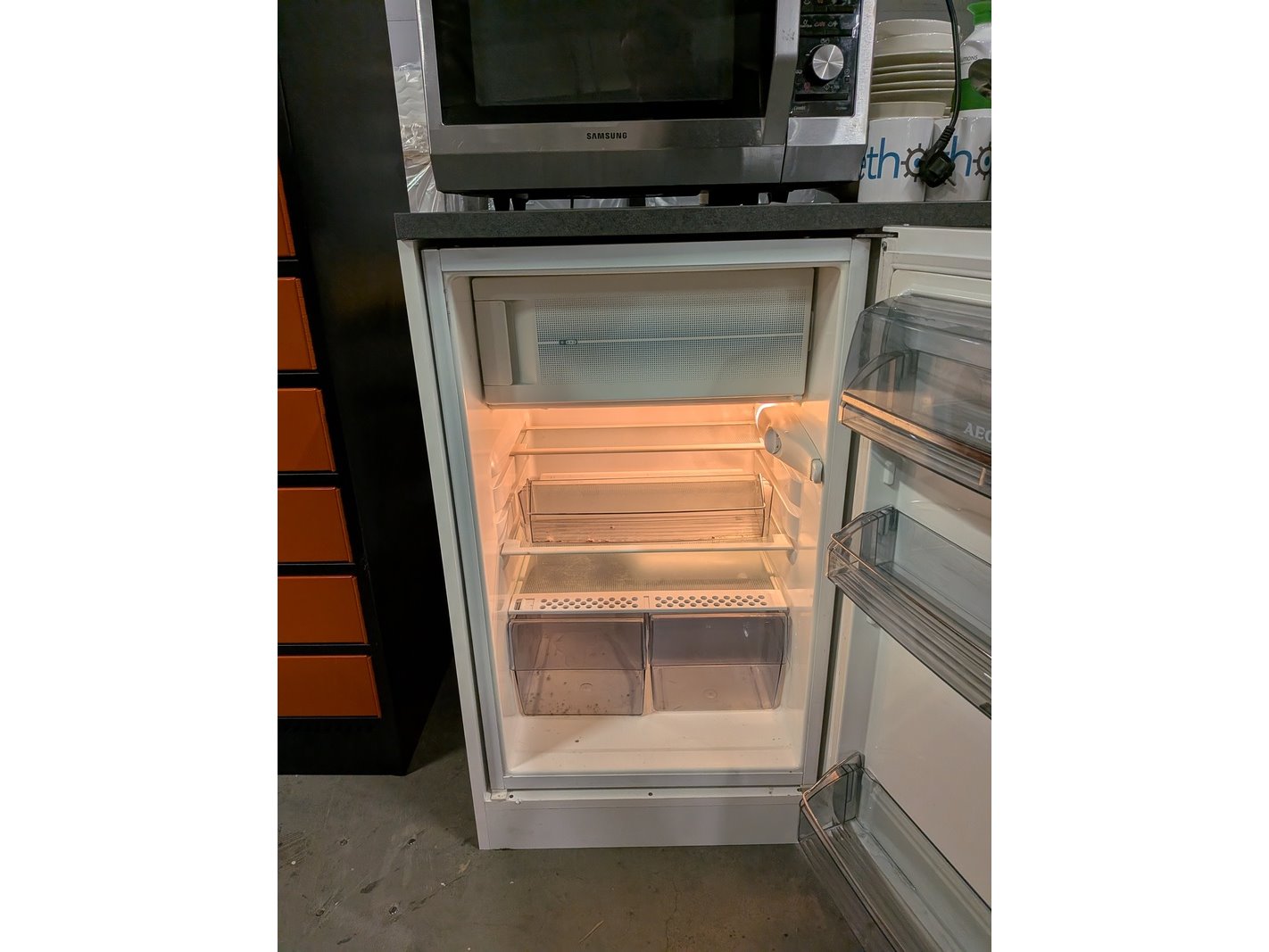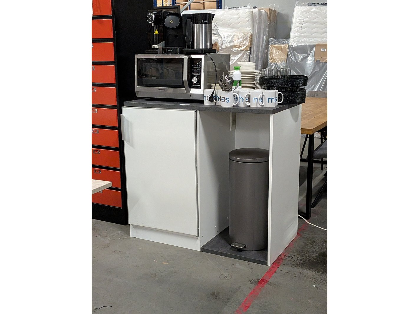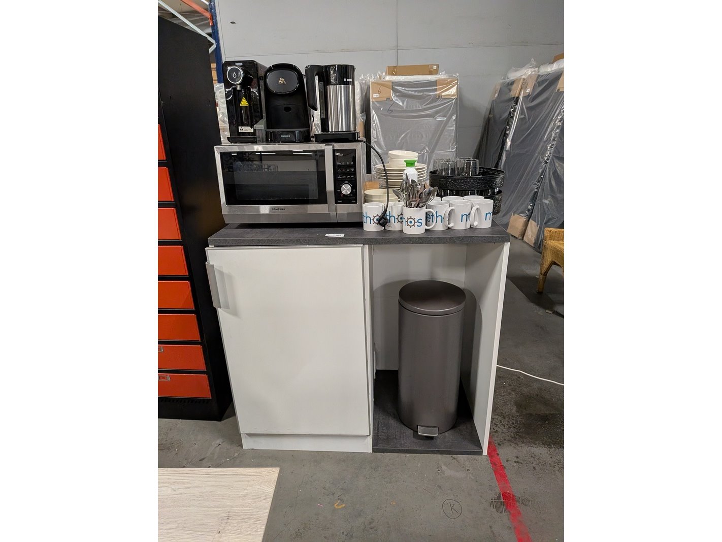 Product: Pantrymeubel met koelkast en toebehoren Kleur: wit/grijs Afmeting: bxdxh ca. 110x65x102cm Conditie: Gebruikt Specificaties: Voorzien van koelkast, combimagnetron, pedaalemmer, koffiemachine, waterkoker, servies Jamie oliver
