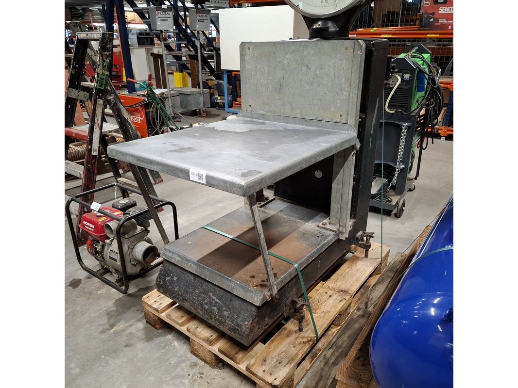 Merk: Berkel Product: Weegschaal Kleur: Staal Materiaal: Staal Afmeting: 130x80x190cm (lxbxh) BouwJaar: 1956 Conditie: Gebruikt Specificaties: Weegvermogen 150kg, met stelwaterpas. Weegplateau is 75x69 cm.