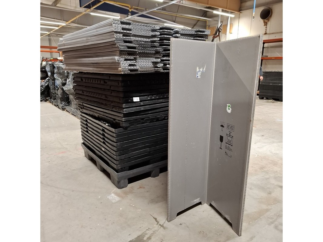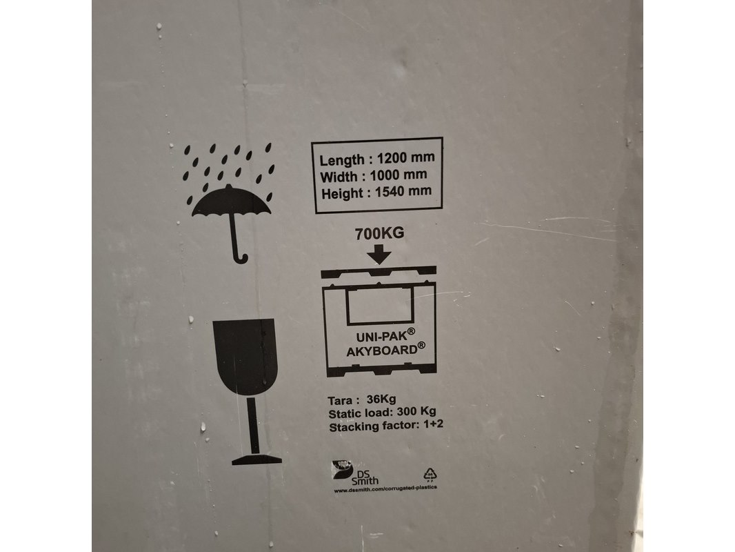 Product: Uni pack Materiaal: Kunstof Afmeting: Lxbxh: 1200x1000x933mm Conditie: Gebruikt Specificaties: Set van 10 uni packs compleet 120 bij 100 incl deksel en onderkant