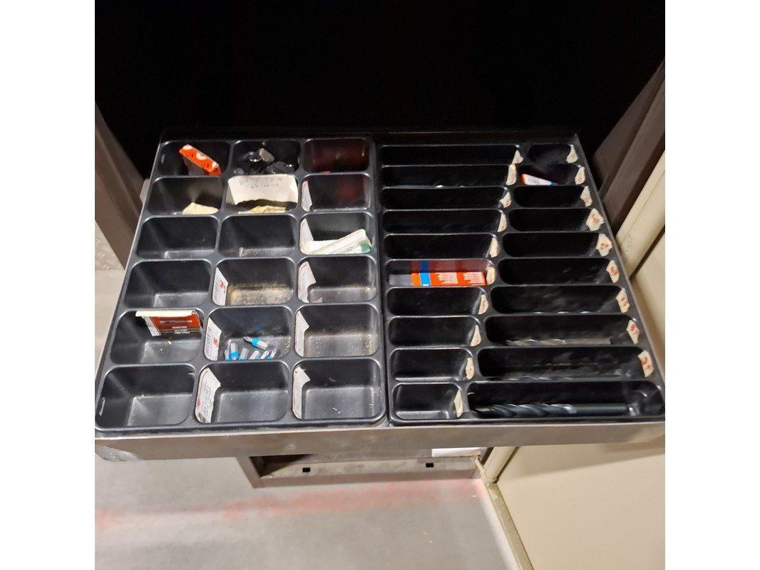 Product: Magazijnkast met inhoud gereedschap Kleur: Bruin Materiaal: metaal Afmeting: bxdxh ca. 53x55x195cm Conditie: Gebruikt Specificaties: oa.: popnageltangen, boren, bitjes etc. Met 2 uittrekbare lades