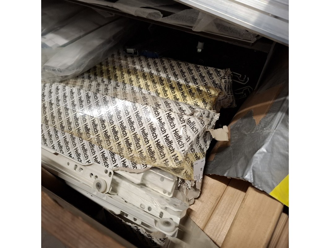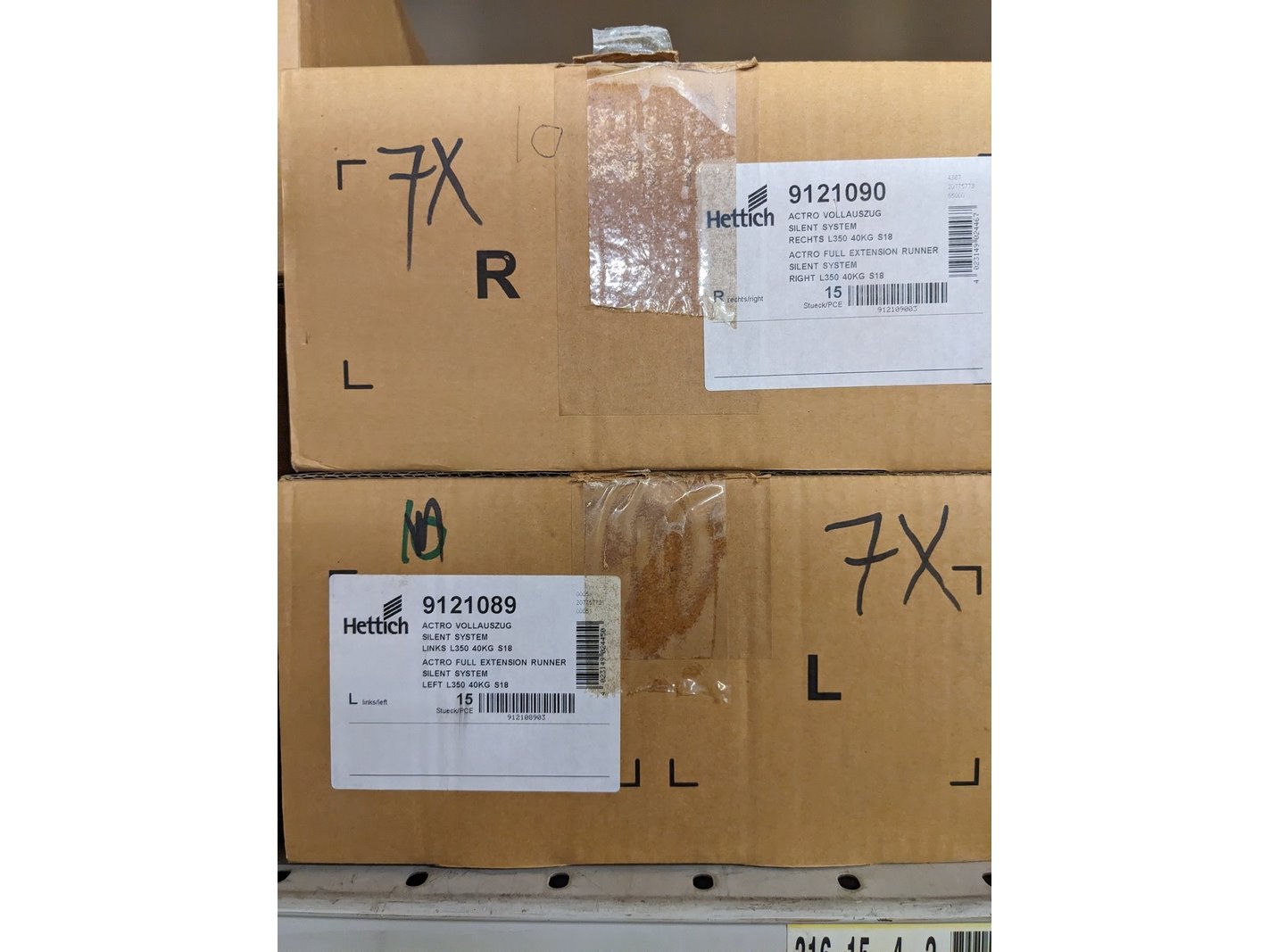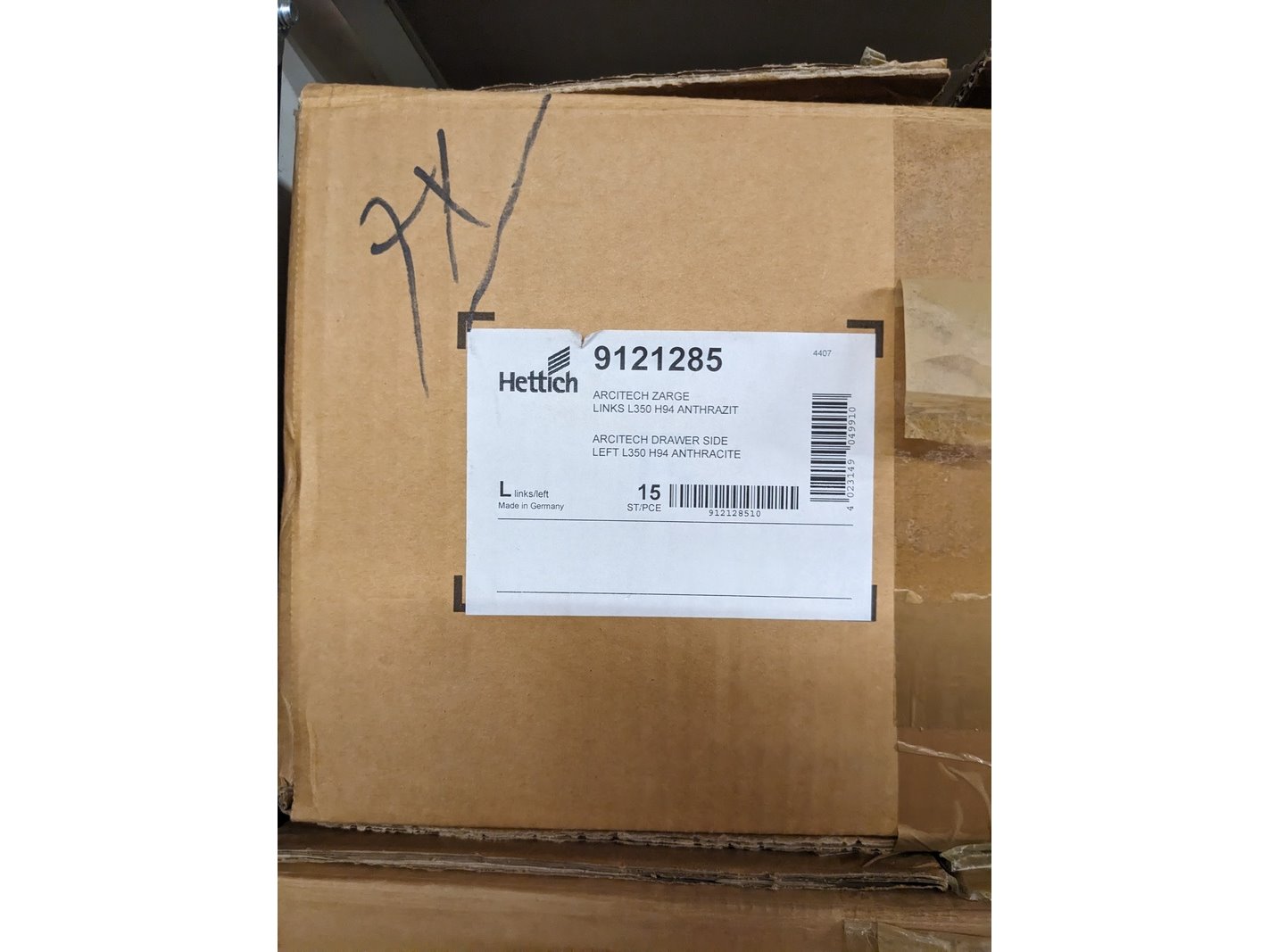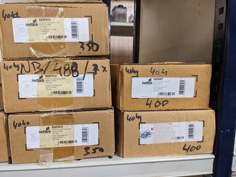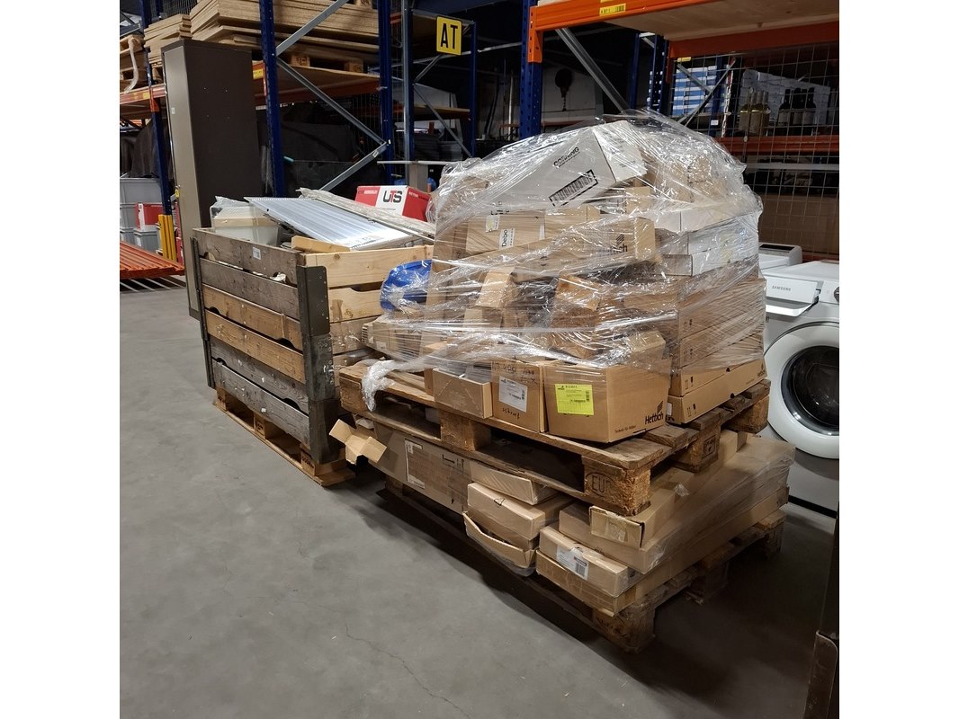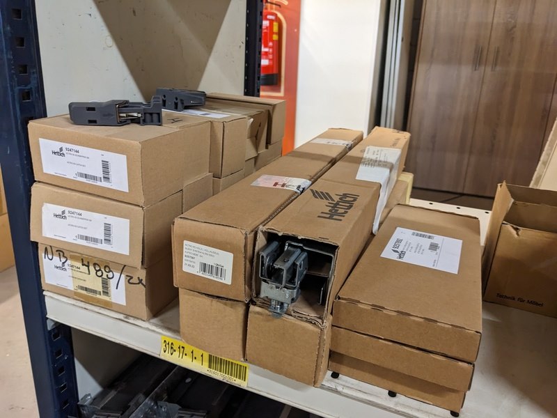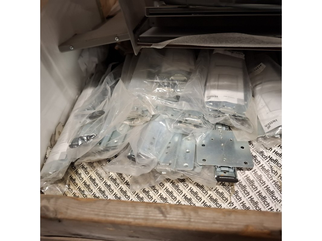 Merk: o.a. Hettich Product: Assortiment meubelbevestigingsmateriaal Specificaties: bestaande uit o.a. : ladegeleiders, frontsluitbeugel, meubel grepen, roosters, tafelpoten, bestekbak, diverse spuitbussen etc. Reeds in krat en op pallets gelegd