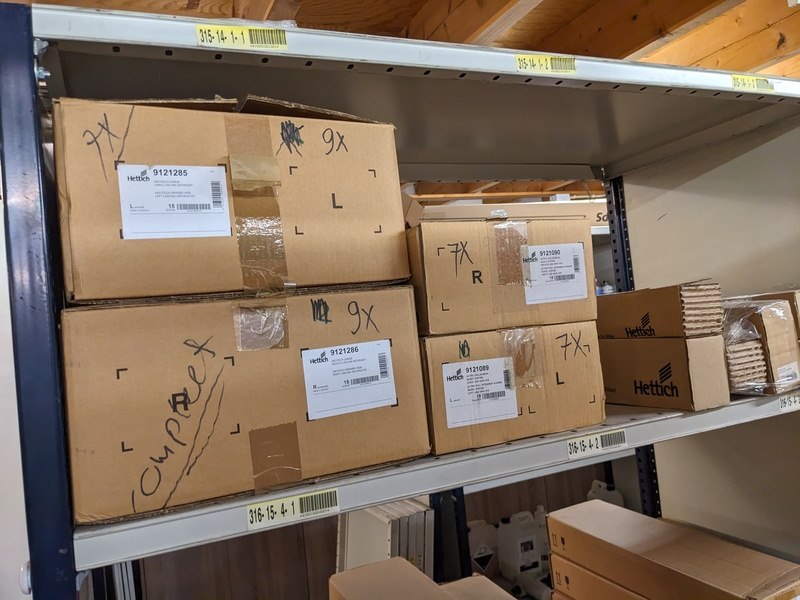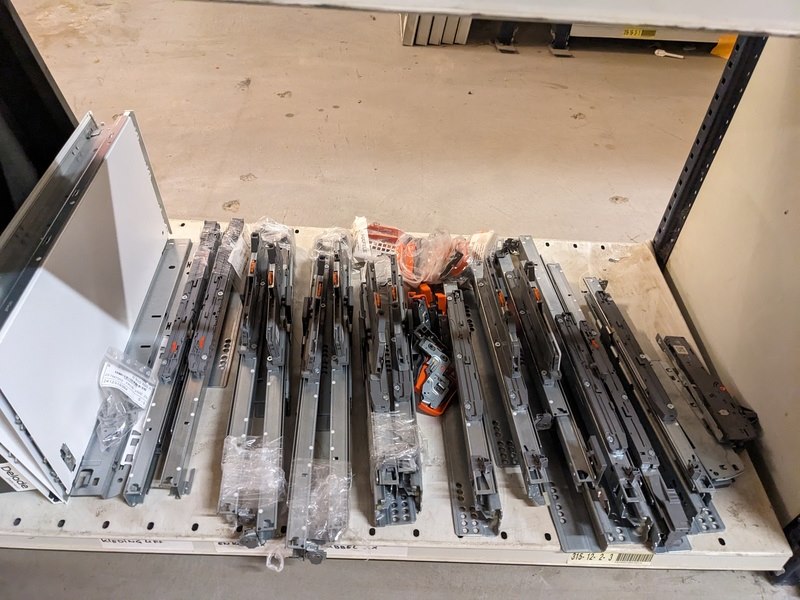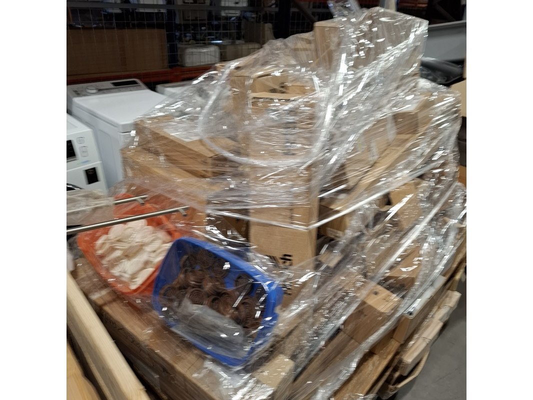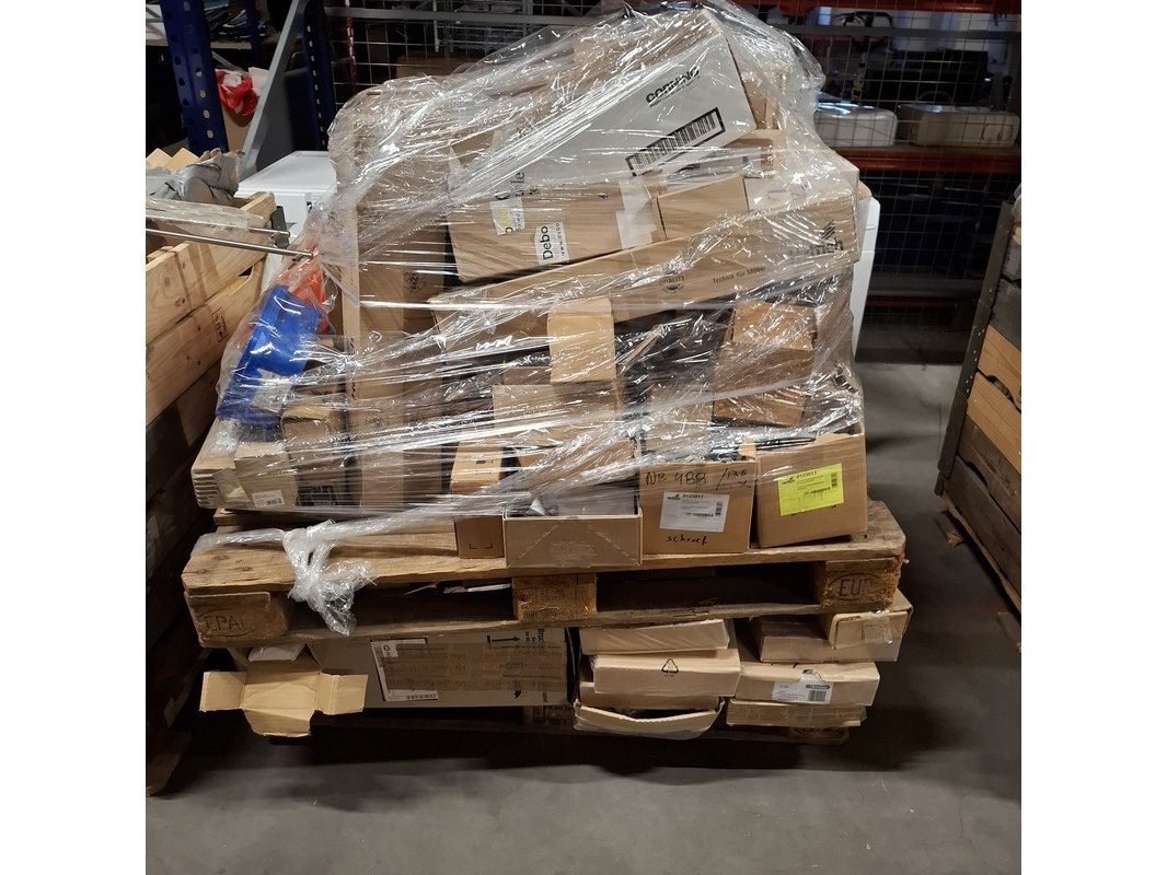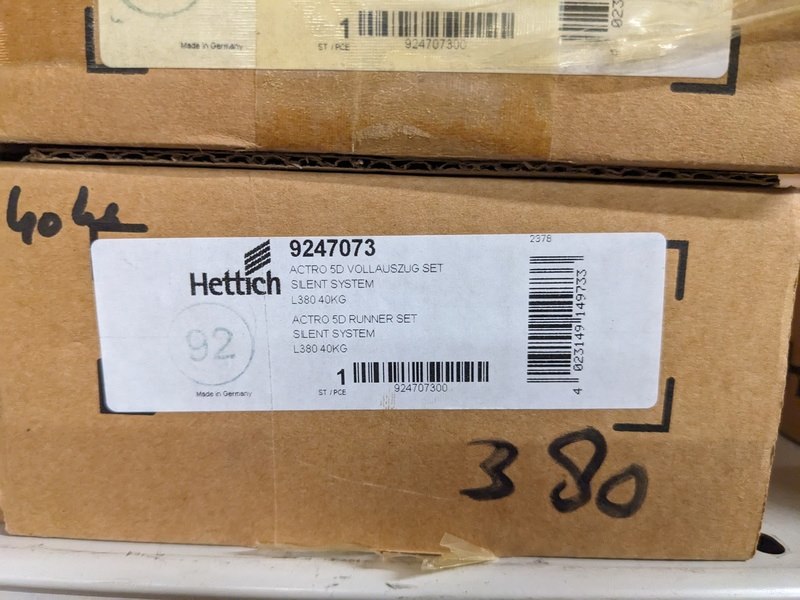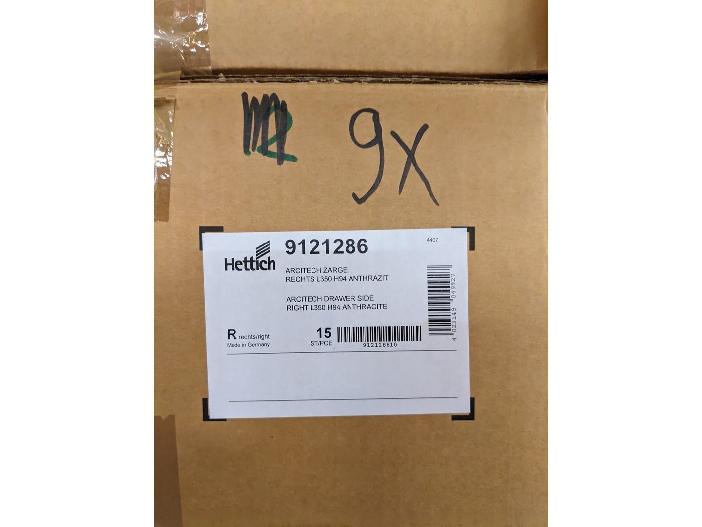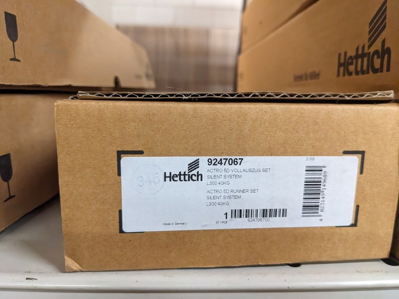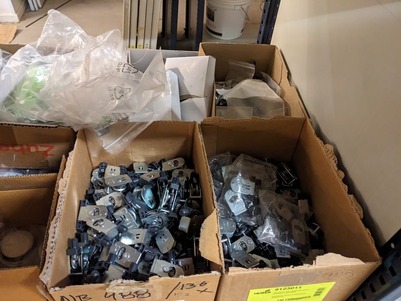 Merk: o.a. Hettich Product: Assortiment meubelbevestigingsmateriaal Specificaties: bestaande uit o.a. : ladegeleiders, frontsluitbeugel, meubel grepen, roosters, tafelpoten, bestekbak, diverse spuitbussen etc. Reeds in krat en op pallets gelegd