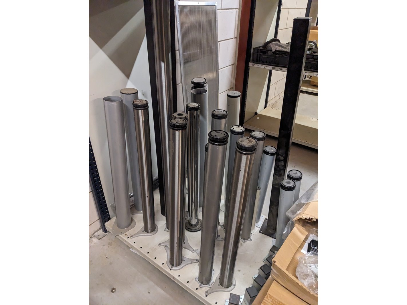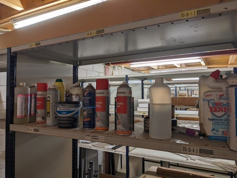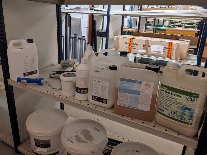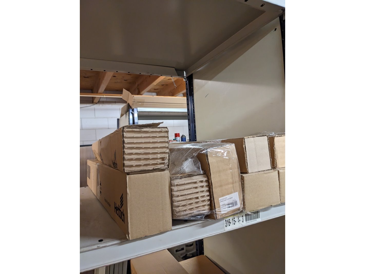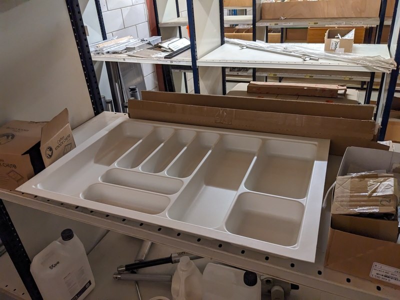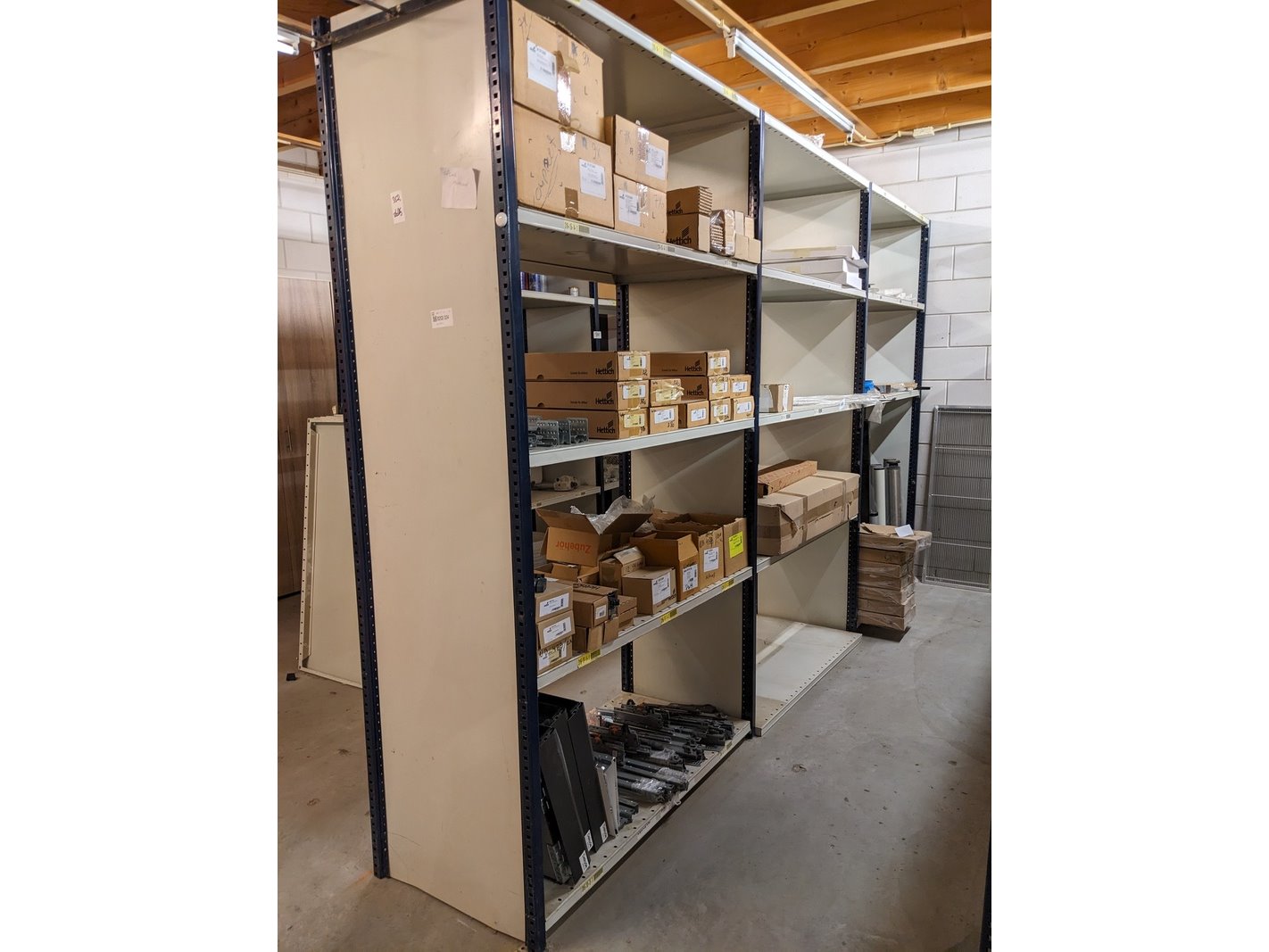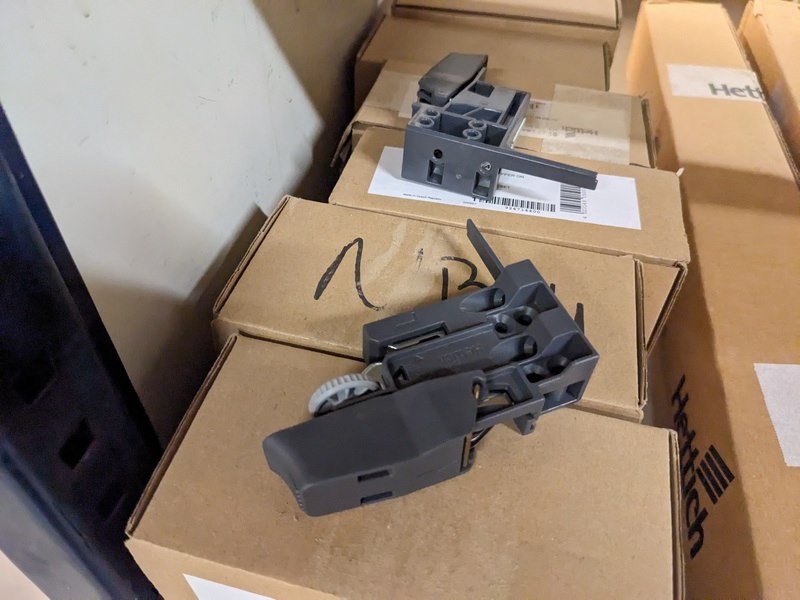 Merk: o.a. Hettich Product: Assortiment meubelbevestigingsmateriaal Specificaties: bestaande uit o.a. : ladegeleiders, frontsluitbeugel, meubel grepen, roosters, tafelpoten, bestekbak, diverse spuitbussen etc. Reeds in krat en op pallets gelegd