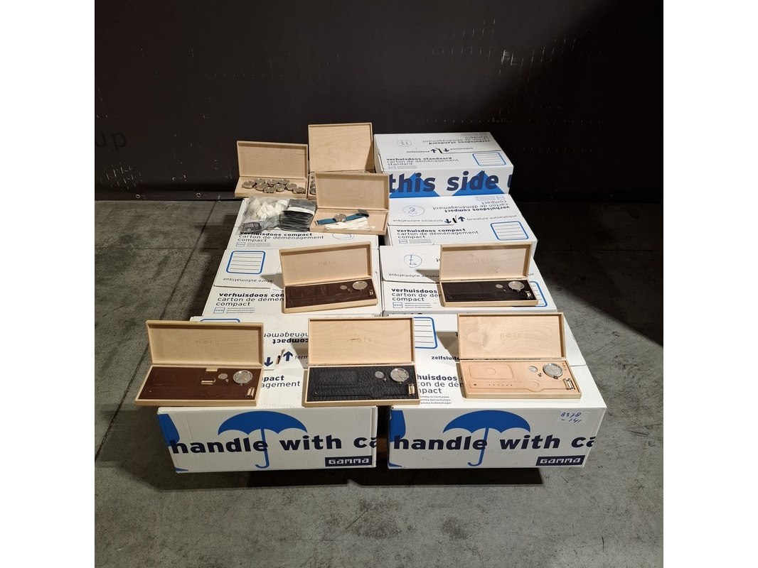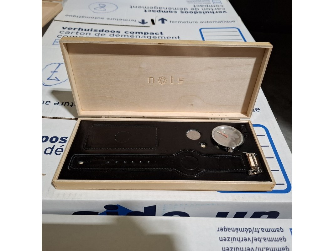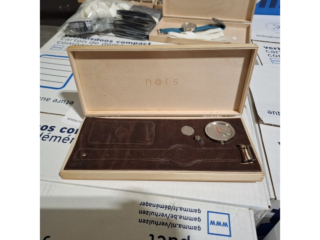 Merk: NOTS / Mondaine Product: Horloges Materiaal: Leren bandjes in diverse kleuren en modellen Conditie: Nieuw Specificaties: Stichting NOTS Foundation (een ANBI) heeft de horloges laten ontwerpen en produceren om geld op te halen voor haar microkrediet en solar lampen activiteiten in Afrika. We hebben 1.500 horloges laten produceren. Bestaande uit: 229x standaard horloge En diverse onderdelen: 3x doos batterijen 15x gebruiksaanwijzing ( in zilveren zakje) 28x losse horloge Partij munten