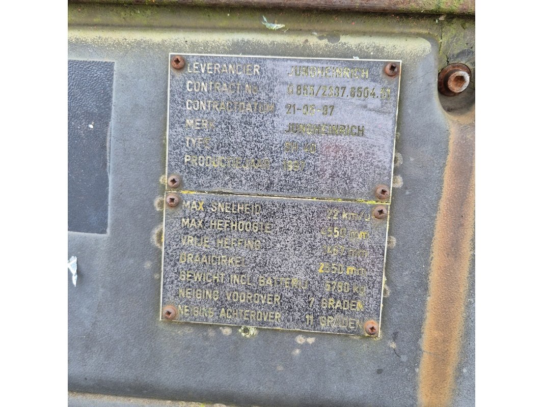 Merk: Jungheinrich Product: Heftruck BouwJaar: 1997 Conditie: gebruikt Specificaties: Maximale hefhoogte: 455 cm. Eigen gewicht incl. accu: 5.780 kg Afgelezen draaiuren: 1.661 uur Lepellengte: 150 cm Diverse schades, gebreken en gebruikssporen rondom Werking van e.e.a. onbekend Gedeelte van raam ontbreekt.