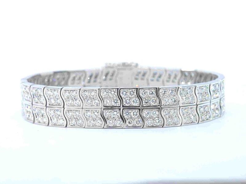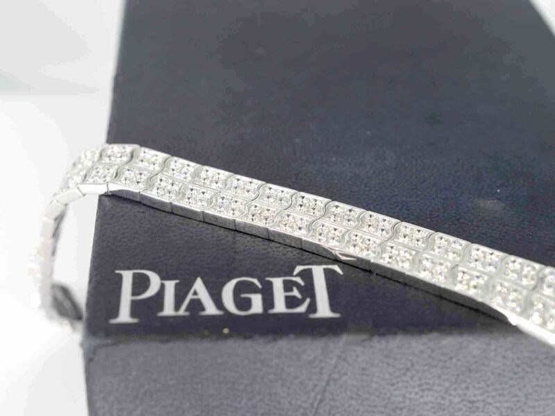 Product: Piaget - Armband met diamanten Specificaties: Diamant: Natuurlijk Slijpvorm: Briljant geslepen Gewicht (carat): 10.06 carat Kleur: F Zuiverheid: VVS1 Slijpkwaliteit: Excellent Juweel: Armband Merk: Piaget Model: The Limelight Vogue Serienummer: B71*** Jaar: 2006 Gewicht: 47 gram Afmetingen/lengte: 18 cm Materiaal: 18K goud (750) Conditie: Nieuw - ongedragen Verpakking: Orginele doos en papieren van Piaget Toelichting: De kwaliteit is overgenomen van het rapport behorend bij item. De waardebepaling is een beoordeling van een gecertificeerde diamantair, gebaseerd op consumentenprijzen.