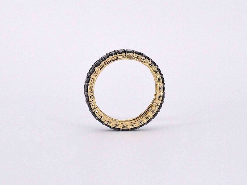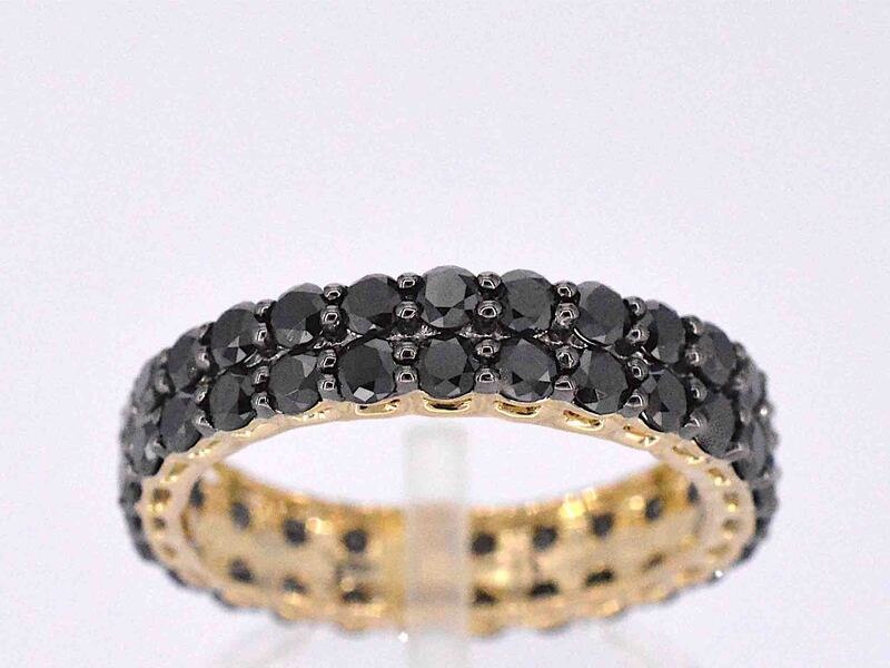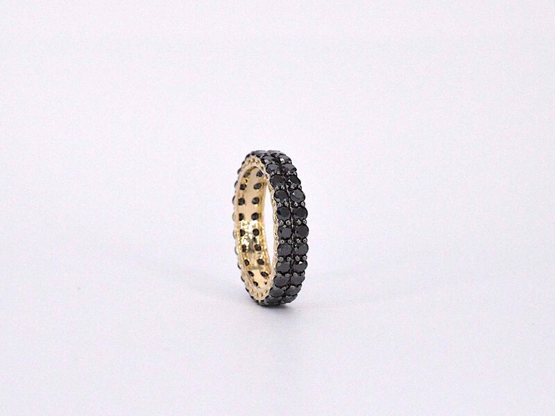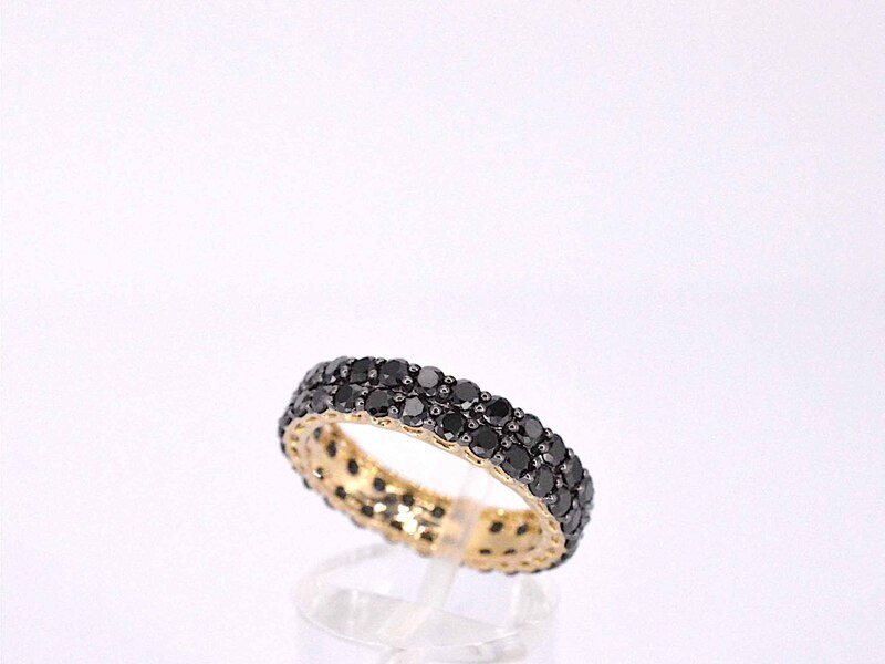 Product: Gouden dubbele eternity ring met zwarte diamanten Specificaties: Diamant: Natuurlijk Aantal: 52 stuks Slijpvorm: Briljant geslepen Gewicht (carat): 4.00 carat Kleur: Zwart Zuiverheid: Opaak (enhanced) Slijpkwaliteit: Zeer mooi Juweel: Ring Gewicht: 3 gram Ringmaat (op maat gemaakt*): 54 (17.25 mm) Materiaal: 14 karaat (585) Conditie: Nieuw Verpakking: Luxe sieradendoos Toelichting: De kwaliteit is overgenomen van het rapport behorend bij item. De waardebepaling is een beoordeling van een gecertificeerde diamantair, gebaseerd op consumentenprijzen. Consumentenprijs: € 2.468,-