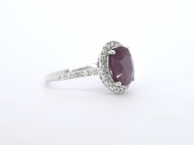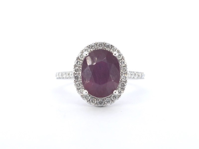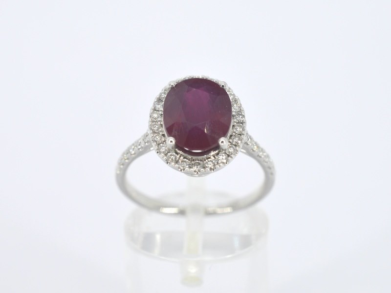 Product: Witgouden entourage ring met diamanten en robijn Specificaties: Diamant: Natuurlijk Slijpvorm: Briljant geslepen Gewicht (carat): 0.40 carat Kleur: F-G Zuiverheid: VS Slijpkwaliteit: Zeer mooi Edelsteen: Robijn Aantal: 1 stuk Slijpvorm: Ovaal Gewicht (carat): 4.00 carat Kleur: Intens rood (enhanced) Zuiverheid: Met natuurlijke insluitsels (enhanced) Juweel: Ring Gewicht: 3 gram Materiaal: 14 karaat (585) Conditie: Nieuw Verpakking: Luxe sieradendoos Toelichting: De kwaliteit is overgenomen van het rapport behorend bij item. De waardebepaling is een beoordeling van een gecertificeerde diamantair, gebaseerd op consumentenprijzen. Consumentenprijs: € 3.080,-