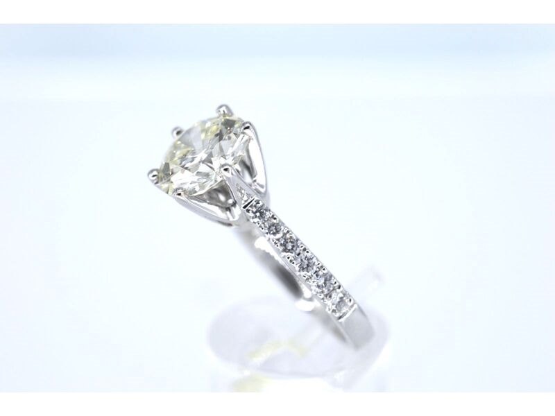 Product: Witgouden ring met diamant met een briljant geslepen diamant van 2.50 carat Specificaties: Diamant: Natuurlijk Aantal: 1 stuk Slijpvorm: Briljant geslepen Gewicht (carat): 2.50 carat Kleur: Warm getint Zuiverheid: VVS Diamant (secundair): Natuurlijk Aantal diamanten: 12 stuks Slijpvorm: Briljant geslepen Gewicht (carat): 0.30 carat Kleur: F-G Zuiverheid: VS Slijpkwaliteit: Zeer mooi Juweel: Ring Gewicht: 3 gram Ringmaat (op maat gemaakt*): 53 (17 mm) Materiaal: 18K goud (750) Conditie: Nieuw Verpakking: Luxe sieradendoos Toelichting: De kwaliteit is overgenomen van het rapport behorend bij item. De waardebepaling is een beoordeling van een gecertificeerde diamantair, gebaseerd op consumentenprijzen. Consumentenprijs: € 49.000,- *Ringen kunnen als het mogelijk is op maat gemaakt worden.