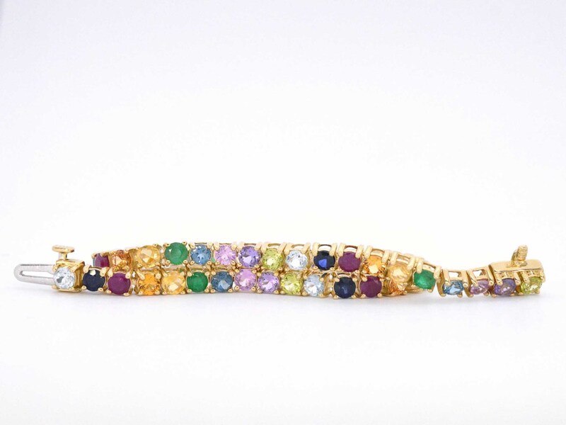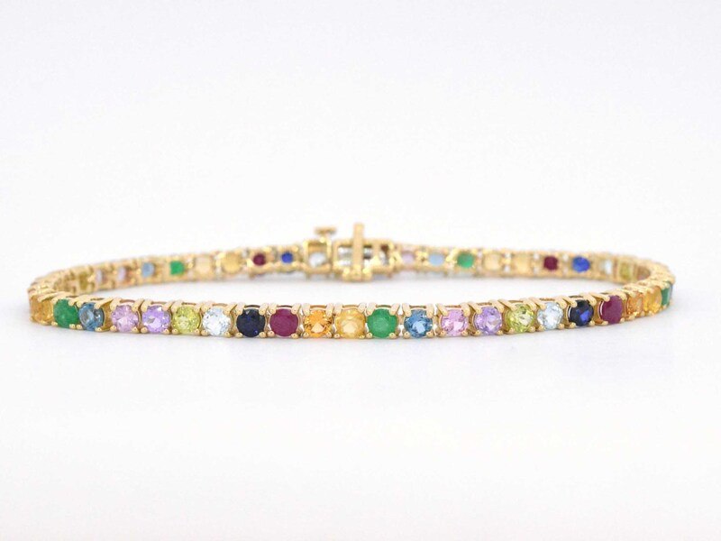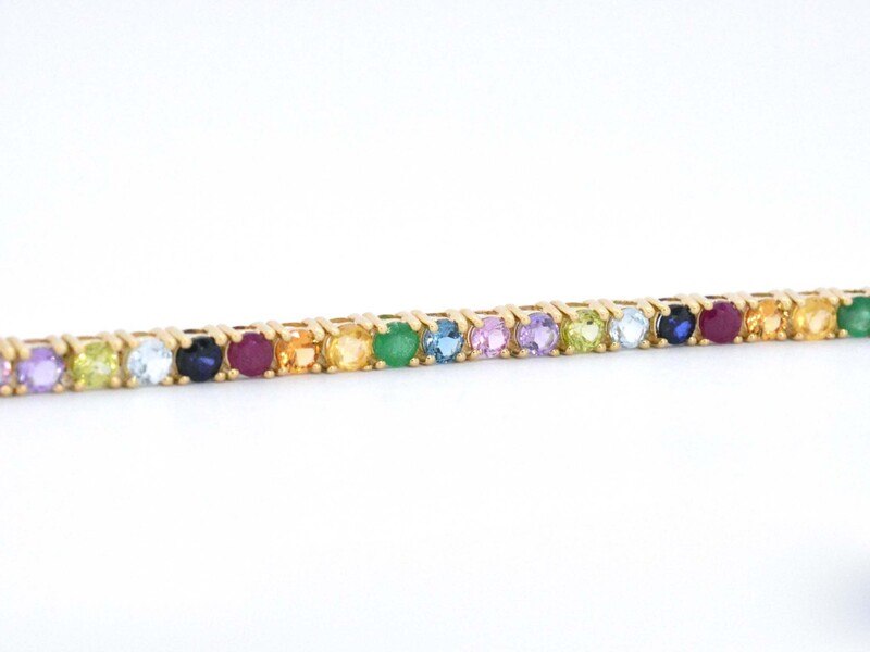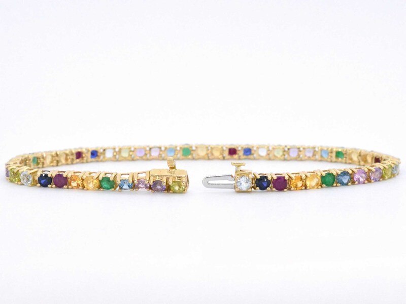 Product: Geelgouden tennisarmband met multi colour edelstenen Specificaties: Edelsteen: Regenboog Slijpvorm: Briljant geslepen Gewicht (carat): 7.50 carat Kleur: multicolour Zuiverheid: Met natuurlijke insluitsels Slijpkwaliteit: Very good Juweel: Armband Gewicht: 10 gram Afmetingen/lengte: 18 cm Materiaal: 14 karaat (585) Conditie: Nieuw Verpakking: Luxe sieradendoos Toelichting: De kwaliteit is overgenomen van het rapport behorend bij item. De waardebepaling is een beoordeling van een gecertificeerde diamantair, gebaseerd op consumentenprijzen. Consumentenprijs: € 6.003,-