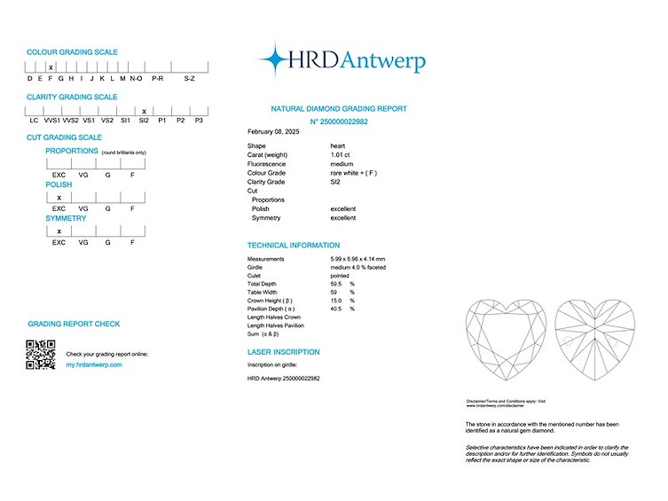 Product: Diamant - 1.01 carat Hart geslepen diamant met een HRD certificaat (gecertificeerd) Specificaties: Diamant: Natuurlijk Aantal: 1 stuk Slijpvorm: Hart vorm geslepen Gewicht (carat): 1.01 carat Kleur: F Zuiverheid: SI2 Slijpkwaliteit: Excellent Certificaat: HRD Certificaat nummer: 250000022982 Conditie: Nieuw Verpakking: Edelsteendoos Toelichting: De kwaliteit is overgenomen van het rapport behorend bij item. De waardebepaling is een beoordeling van een gecertificeerde diamantair, gebaseerd op consumentenprijzen. Consumentenprijs: € 9.600,-