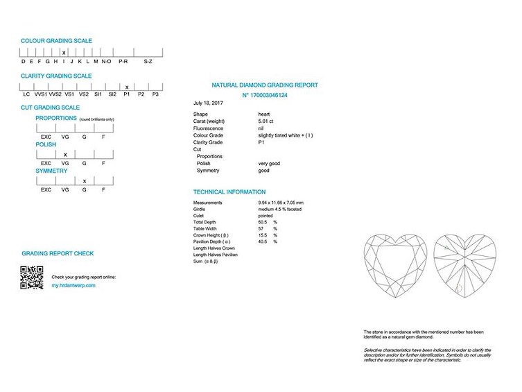 Product: Diamant - 5.01 carat Investeringsdiamant met HRD certificaat (gecertificeerd) Specificaties: Diamant: Natuurlijk Aantal: 1 stuk Slijpvorm: Hart vorm geslepen Gewicht (carat): 5.01 carat Kleur: I Zuiverheid: P1 Certificaat: HRD Certificaat nummer: 170003046124 Extra informatie: Meest romantische slijpvorm die er is. Conditie: Nieuw Verpakking: Edelsteendoos Toelichting: De kwaliteit is overgenomen van het rapport behorend bij item. De waardebepaling is een beoordeling van een gecertificeerde diamantair, gebaseerd op consumentenprijzen. Consumentenprijs: € 168.000,- *Ringen kunnen als het mogelijk is op maat gemaakt worden.